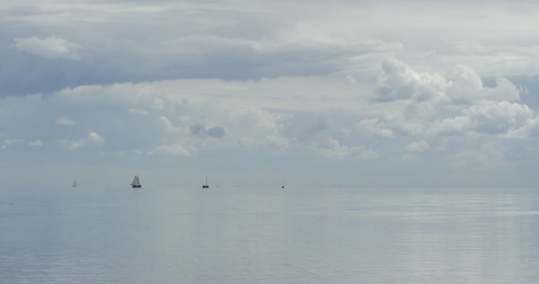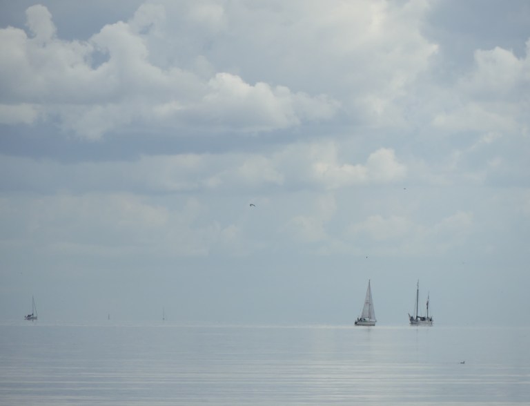 Waar is de horizon? Dit bijzondere schouwspel zagen we een paar dagen gelden, op weg naar Hoorn. Je rijdt daar een tijdje onder langs de IJsselmeerdijk maar op een gegeven moment kun je over de dijk heen kijken.