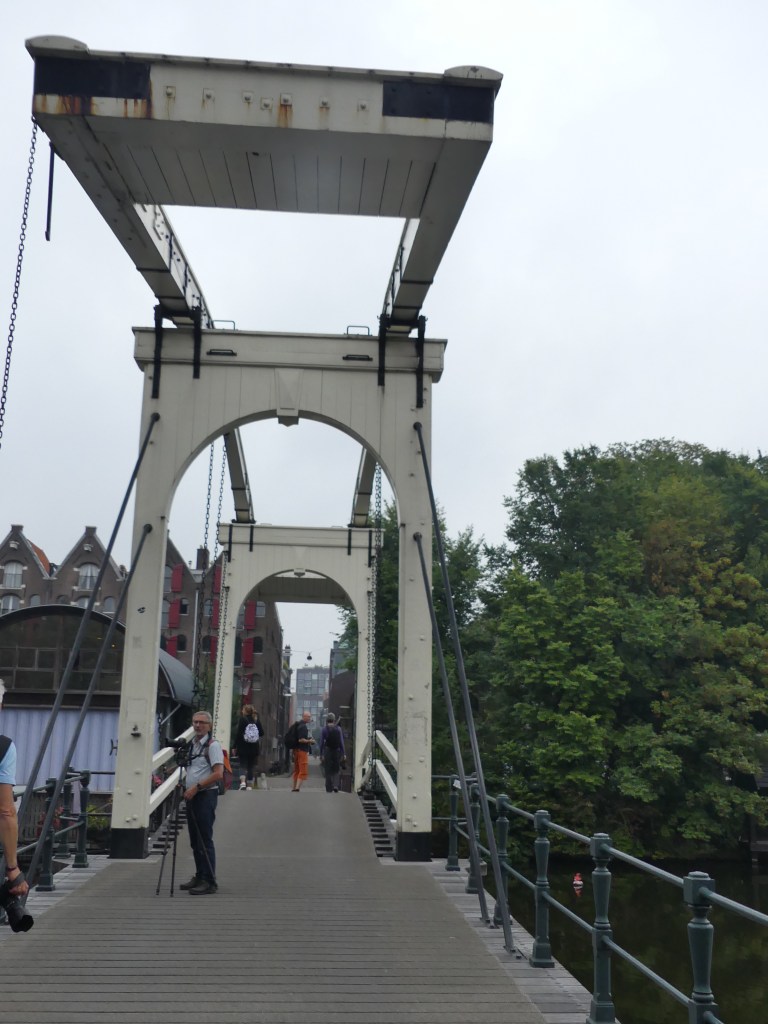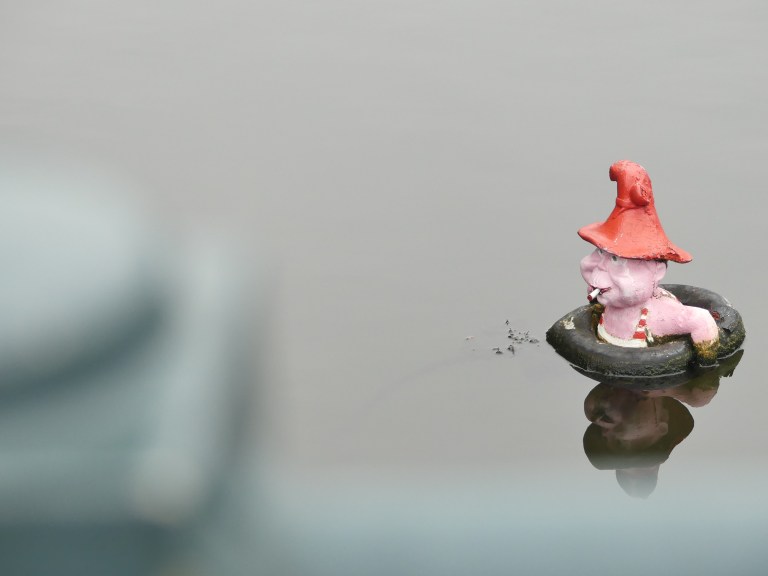 Bij stadswandelingen door Amsterdam kijk ik veel omhoog naar al die mooie gevels en doorkijkjes. Tijdens de tocht met mijn fotomaatjes viel mijn oog opeens op dit gekke mannetje in een gracht bij het Prinseneiland.