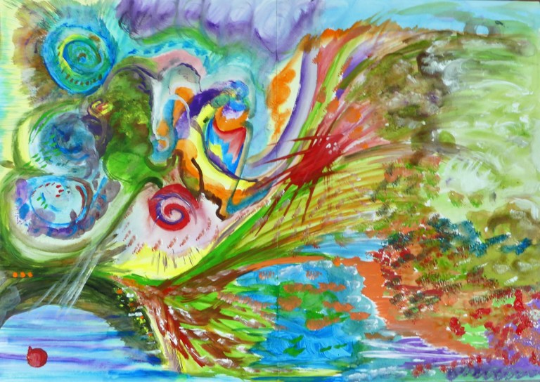 Mijn schilderlessen krijgen dit jaar een vervolg. Een oefening in kleurenleer was meteen een manier om ons vrij te laten schilderen. En dan vrij in de betekenis van niet terugvallen op het bekende, doen wat in je opkomt, alles uitproberen, maar het grote blad moet vol. Primaire -en complementaire kleuren aan de hand van de kleurenleer van Innen bewust leren gebruiken. Dit was mijn resultaat.