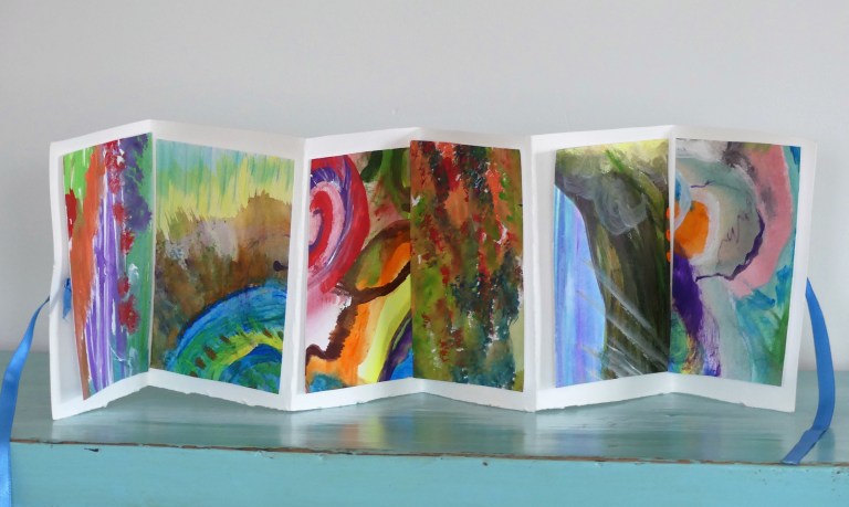 Ik vind het fijn om ze te kunnen bekijken. Toen kwam ik de intrigerende naam Leporello tegen. In die vorm kan ik ze uitstallen. Het is gewoon een zigzag vouwsel, dat dicht kan met een strikje als boek, maar je kunt het ook rechtop zetten. Perfect geschikt voor mijn doel.