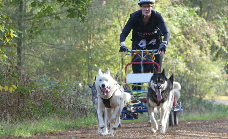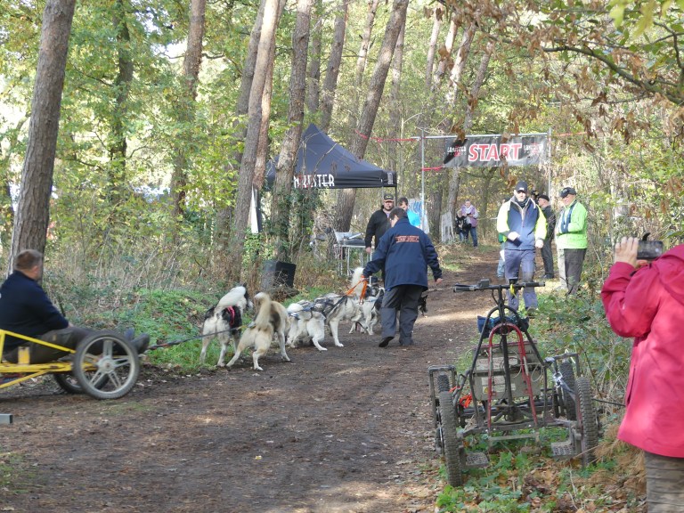 Er moesten nog flink wat kilometers gelopen worden, dus we hadden geen tijd om langer te blijven kijken. Onderweg kwamen we weer op het wedstrijdparcours terecht en daar hadden we geluk om zo’n kar met sledehonden aan het werk te zien.