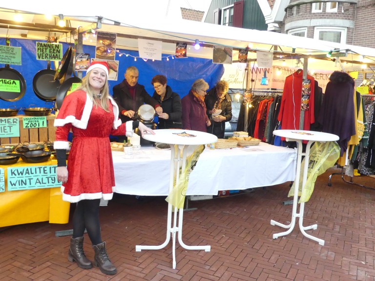 Ons gerenoveerde dorpsplein is nu uitermate geschikt om een kerstmarkt te houden. De opstelling van de kramen is dan ook veel knusser dan voorheen. Vrijdagavond was het zover. Het is traditie geworden, dat ons koor daar staat met een kraam.  Wij zongen dit keer niet, maar om de kas te spekken verkochten we er erwtensoep , uiensoep en zuurkool met bijpassende ingrediënten. Ik heb geholpen bij het inrichten van de kraam. Dat was al een gezellige, maar koude bedoening. Die warme soep was welkom voor veel mensen, die daar in de vrieskou rondliepen. En ……… zo komen we langzaam in kerstsferen.