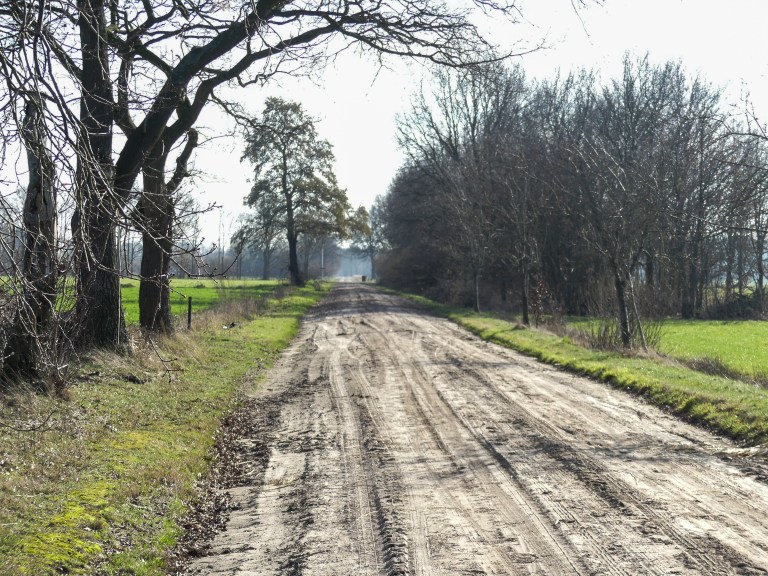 Het laatste stuk van de etappe werd wat vlakker. We liepen we over lange kaarsrechte zandwegen. Je kunt hier de geschiedenis van het ontginnen van de heidegronden aflezen aan het landschap. De boeren hebben met gebruik van mest de waardeloze zandgronden omgetoverd tot een mooi bedrijf. De naam Schaddenveldsweg herinnert er nog aan, dat hier vroeger overal heide was: schadden zijn heideplaggen.
