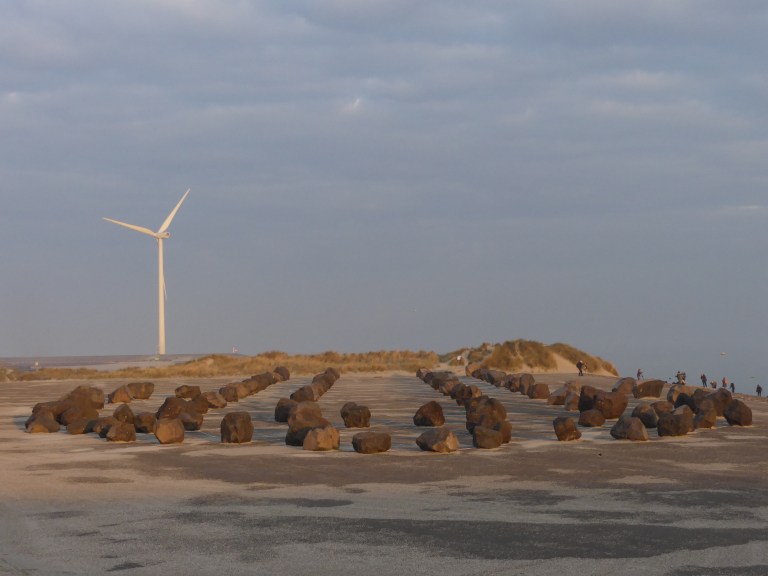 Terwijl wij de zonsopkomst boven de Oosterscheldekering fotografeerden, zag ik vanaf het talud naar beneden kijkend, daar grote keien liggen. Niet kris kras door elkaar maar in een bepaalde formatie.