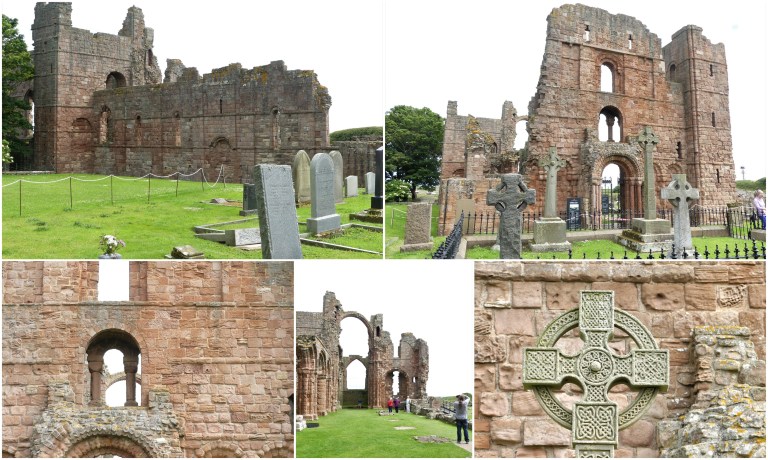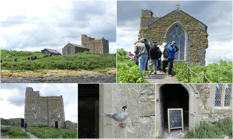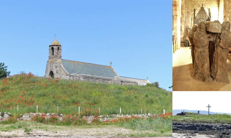 en er is een klein eilandje met een kruis. Daar trok Cuthbert zich terug voor bezinning en meditatie. Op de plek van het kruis stond ooit een kapel. Bij laag water loop je er zo op. In de kerk staat een indrukwekkende houten beeldengroep van monniken met doodskist. Het vertelt het verhaal over de omzwervingen van het lijk van Cuthbert.