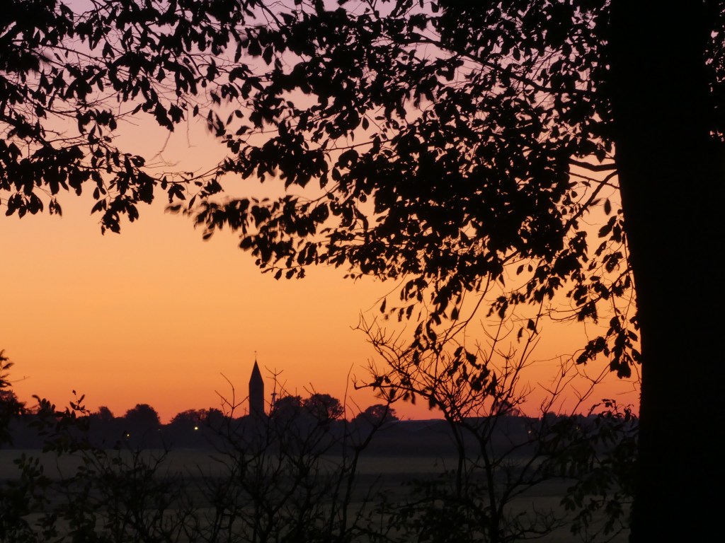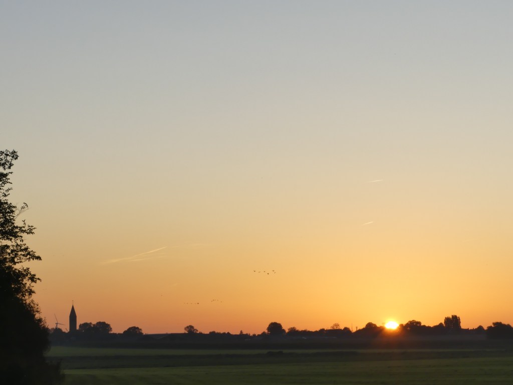 Om 7.00 uur liep ik buiten en het duurde nog tot rond half 8 voordat de zon achter de horizon vandaan kwam en het licht was. Het is de kerk van Oosterland die je in de verte ziet.
