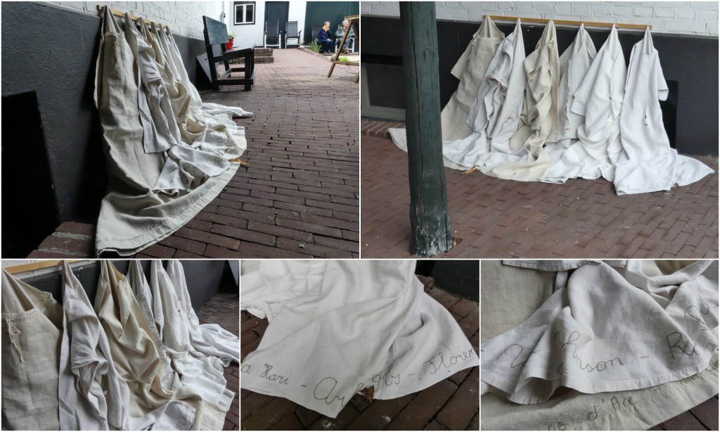 Met borduurwerk op oude nachthemden vraagt ze aandacht voor mensen, die een voorbeeld zijn en met hun inzet de wereld misschien een klein beetje beter hebben gemaakt.