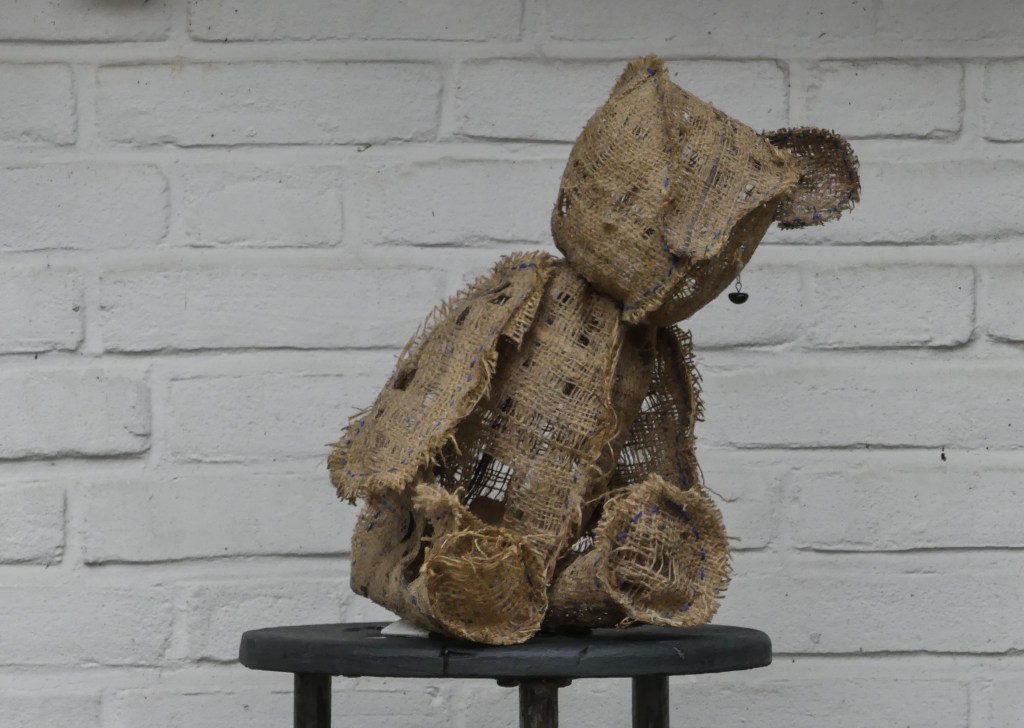 Wat een bijzondere kunst maakt zij. Dat beertje, jeetje die is bijzonder. De foto in combinatie met textiel vind ik ook heel bijzonder.