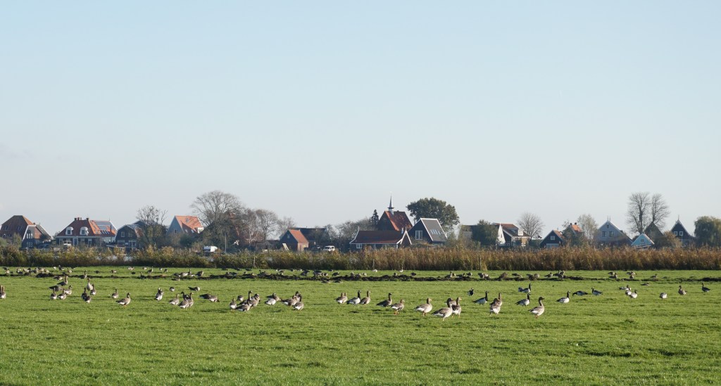 Vogels, met name ganzen waren er weer genoeg. Bij Uitdam bereikten we de dijk langs het IJsselmeer, die we volgden tot de afslag terug naar de auto.
