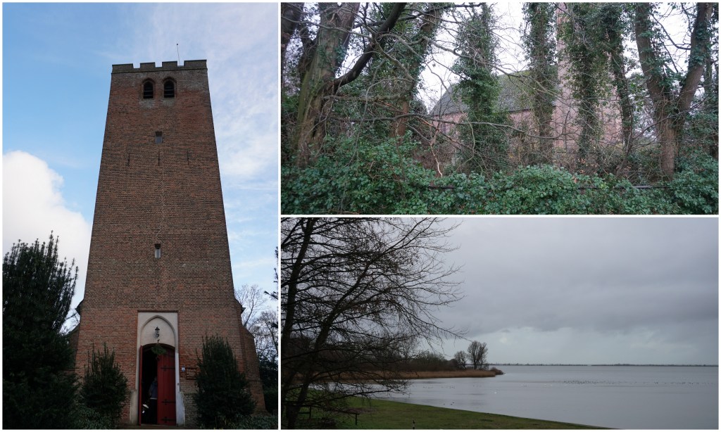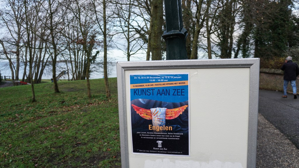 Als locatie hadden de kunstenaars Joke Leicht, Berdien Nieuwenhuizen, Marjolein Endert en Helen Vreedeveld gekozen voor Kerk aan Zee in Muiderberg. Wat een prachtlocatie was dat. De kerk torent hoog uit over de zee (nu natuurlijk het IJsselmeer) en je loopt erheen over het Kerkpad. Meteen loop ik te mijmeren over vroeger en zie al die kerkgangers van heinde en verre op de kerk afkomen.
