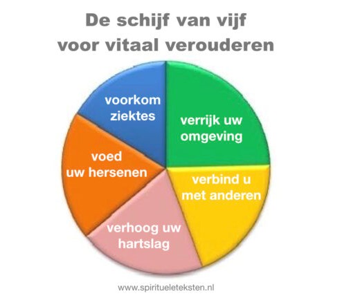 En ja, je kunt er niet omheen dat ouder worden inhoudt, dat het langzaam bergafwaarts met je gaat. Maar om het verval van je hersenen tegen te gaan, heeft ze de schijf van 5 V’s bedacht. Als je een leefpatroon inbouwt naar deze schijf van 5 houd je niet alleen je lijf, maar ook je hersenen langer vitaal. Beiden zijn natuurlijk onlosmakend met elkaar verbonden.