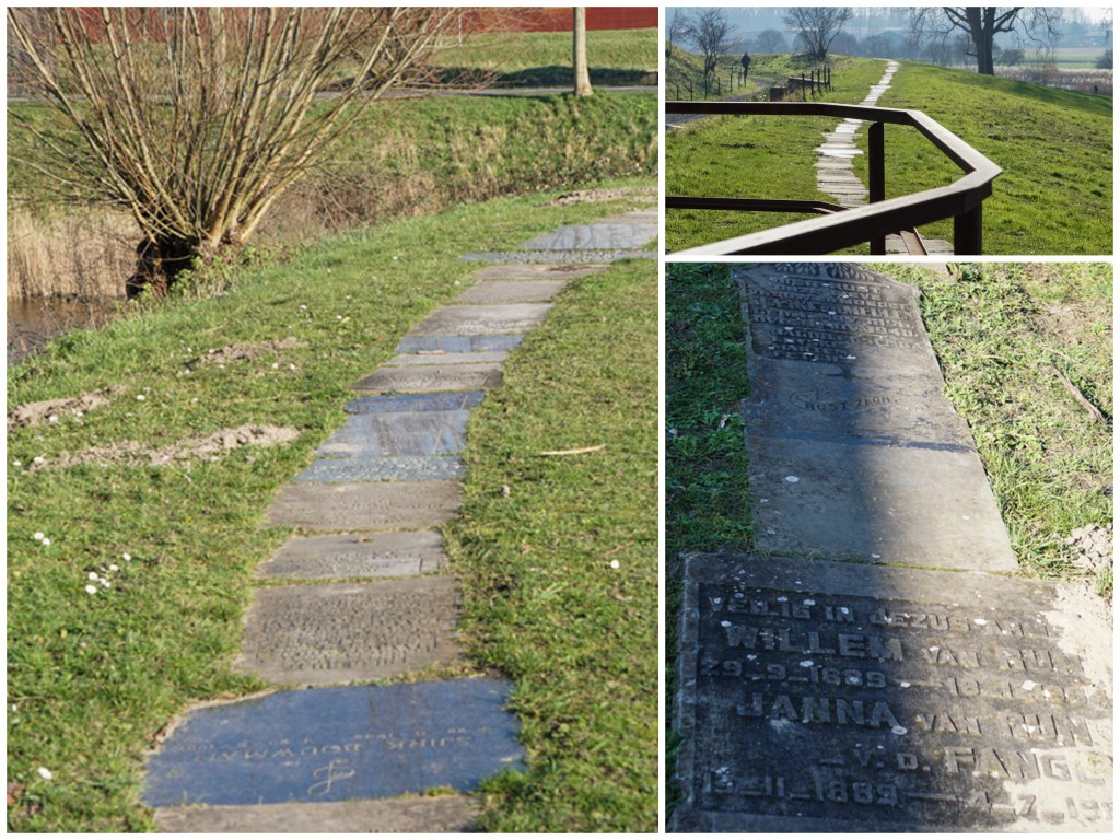 We beklommen de omwalling, die achterlangs liep en zagen daar dat het pad was gemaakt van grafstenen. Op de toelichting stond, dat de beeldend kunstenaar Hans van Houwelingen hier een 400 meter lang pad van oude grafstenen heeft aangelegd: Sluipweg, waarlangs de dood heeft weten te ontsnappen. De gerecyclede grafstenen heeft hij verzameld, om daarmee de dood naar het fort te halen. Er is voor zover bekend hier namelijk nog nooit iemand gesneuveld door militaire acties, want de hele waterlinie is nooit gebruikt en heeft nooit gefunctioneerd als zodanig.