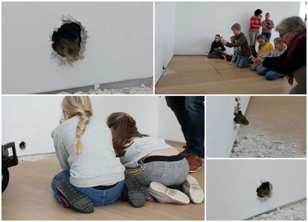 Nieuw is de muis. Een hele zaal voor een muis, die een gat in de muur geknaagd heeft en die vandaar uit beweegt en praat met de mensen. Je hoort de stem van de 9 jarige dochter van de kunstenaar Ryan Gander. Zij leest de tekst van Charlie Chaplin voor uit The Great Dictator. De muis is verzekerd van heel veel belangstelling, zo leuk! Maar of de tekst overkomt betwijfel ik. Zeker is wel, dat het de nieuwe publiekstrekker is voor jong en oud!