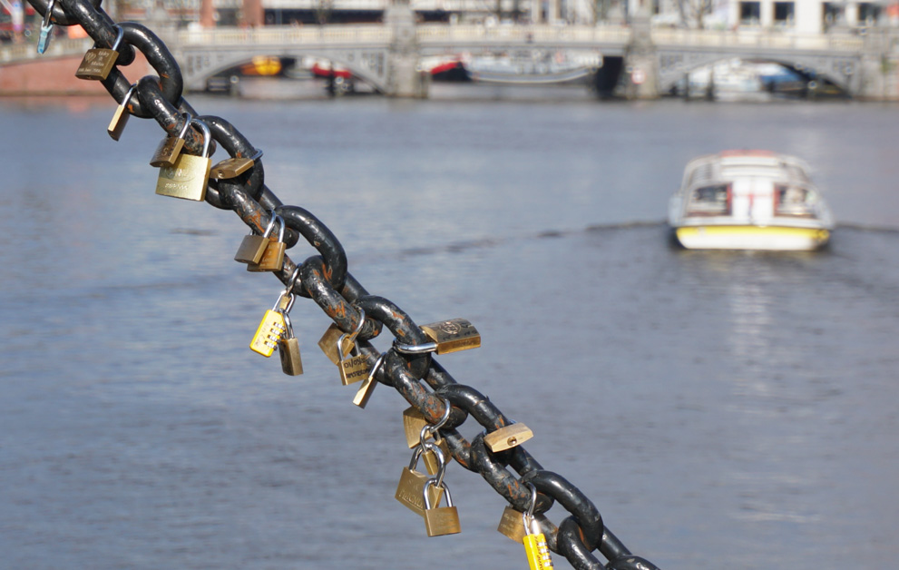 Door de Plantagebuurt liep ik naar de Amstel. Op de brug zag ik, dat ze hier ook meedoen aan de slotjes-rage, zij het in wat beperktere mate dan dat ik bijvoorbeeld wel eens in Italië heb gezien.