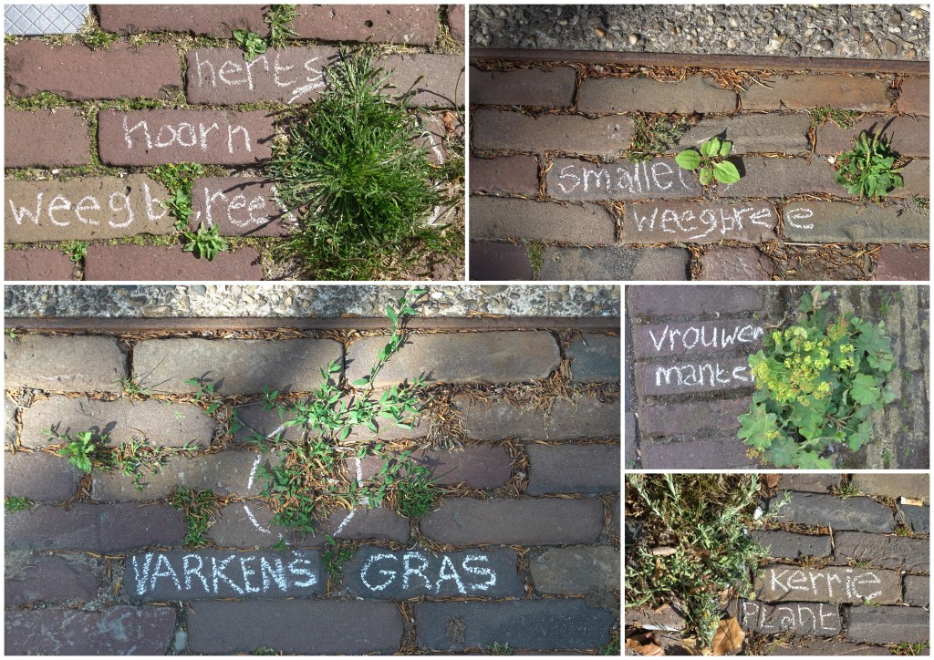 Vanuit andere steden is het overgewaaid naar ons dorp. Opeens staan er op straat namen bij onkruid, dat tussen de straatstenen of stoepranden groeit. Voordat de regen het stoepkrijt doet verdwijnen, kan ik oefenen met het herkennen en benoemen van plantjes en kan ik een fotografisch herbarium aanleggen, zo leuk!
