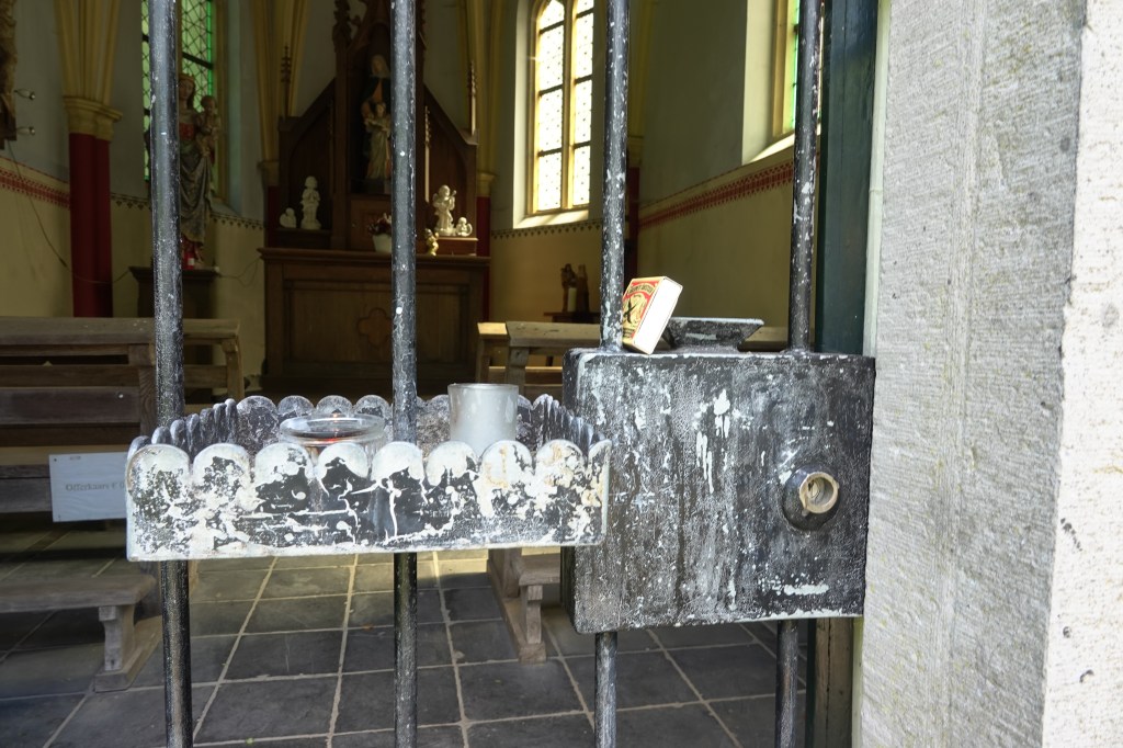 Mensen komen even bij de poort een kruisje slaan of een kaars opsteken voor een mooie intentie. Lucifers worden bij geleverd.