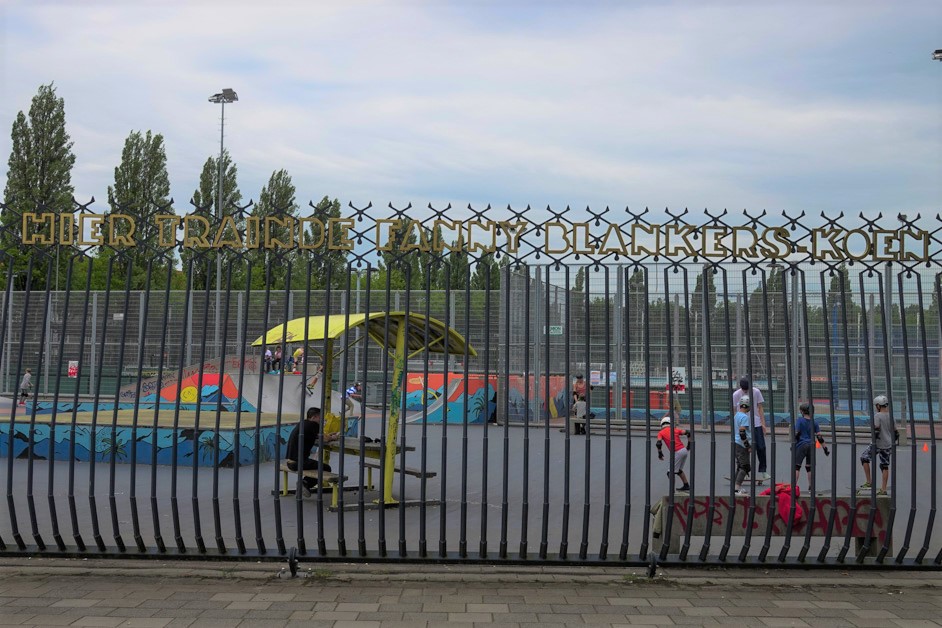 Fanny Blankers Koen, Nederlands bekendste atlete, trainde ooit, waar nu een heerlijke skatebaan is voor de jeugd. Het staat in gouden letters in het hekwerk gesmeed.