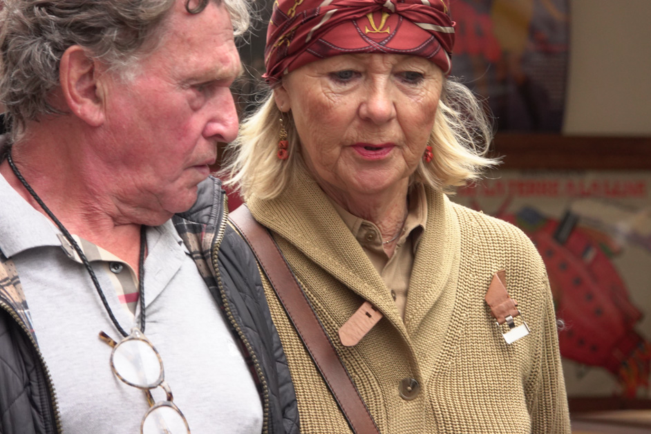 Een foto die in de categorie straatfotografie valt, met eigenlijk een verhaal hebben. Of je moet jezelf vragen stellen over wat je ziet. Bij deze foto zie je mensen, die zo te zien niet echt een heel ontspannen of leuk gesprek hebben. Waar zullen ze het over hebben? Ze zijn heel geconcentreerd en vergeten alles om zich heen. De vrouw viel me op vanwege haar opvallend uiterlijk en haar hoofddoekje matcht mooi de kleur van de achtergrond posters. Maar dat laatste is een toevalstreffer. De foto intrigeert me, dus en dat lijkt me een goede eigenschap voor een straatfoto.