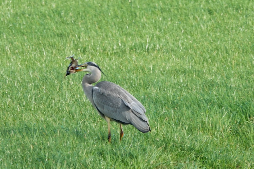 2. Ik zag eens een reiger een kikker aan de haak slaan bij onze vijver toen, maar dat was nog een heel karwei hoor, die moest eerst dood voordat hij werd ingeslikt.