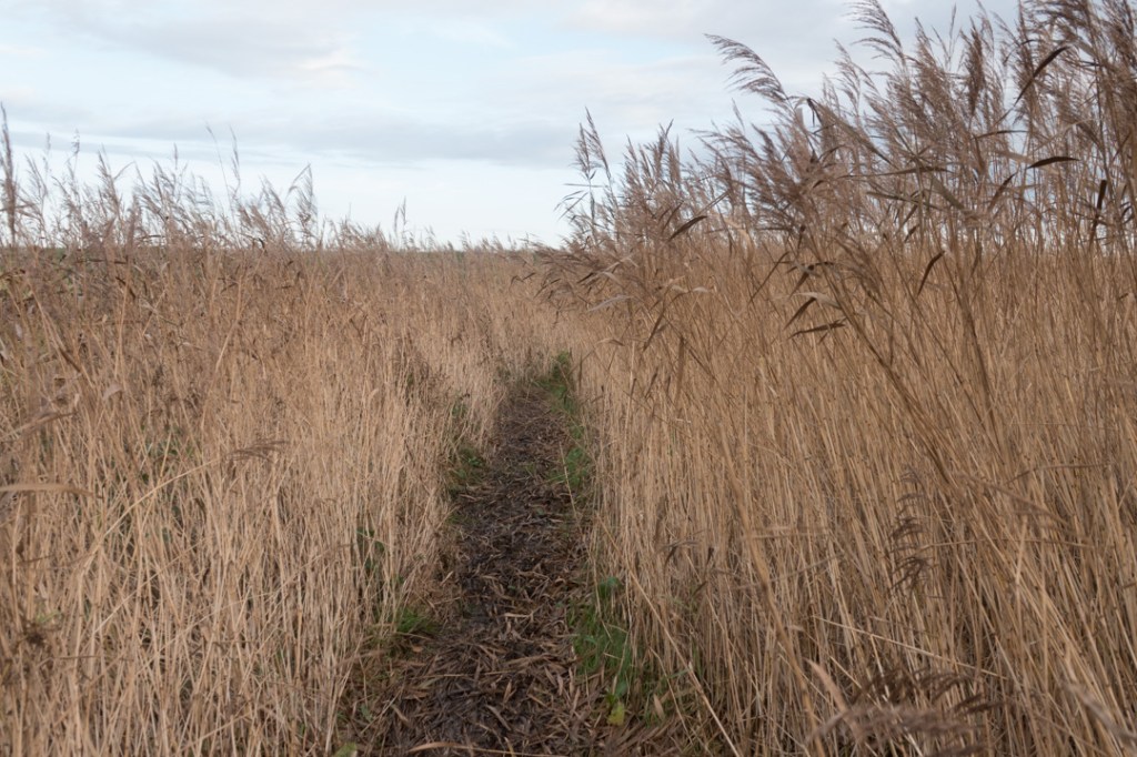 We moesten flink omlopen, langs de buitenranden van het weiland. Daar lag een boerenruzie aan ten grondslag. Een boer die eigenlijk liever niet meer ziet, dat er een wandelpad over zijn land loopt. Het is er jaren geweest, maar gelukkig kun je er nog steeds wandelen, weliswaar dan buiten om in plaats van dwars-over. Aan het eind liep het pad door rietlanden. Ook een leuke ervaring.