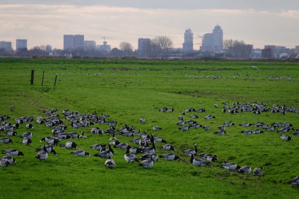 Het is hier zo mooi landelijk en nu met al die brandganzen, die de weilanden bevolken, zie je helemaal mooi de tegenstelling van het platteland met de stad. Het heet hier niet voor niets landelijk Noord onder de rook van Amsterdam.