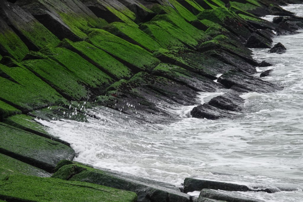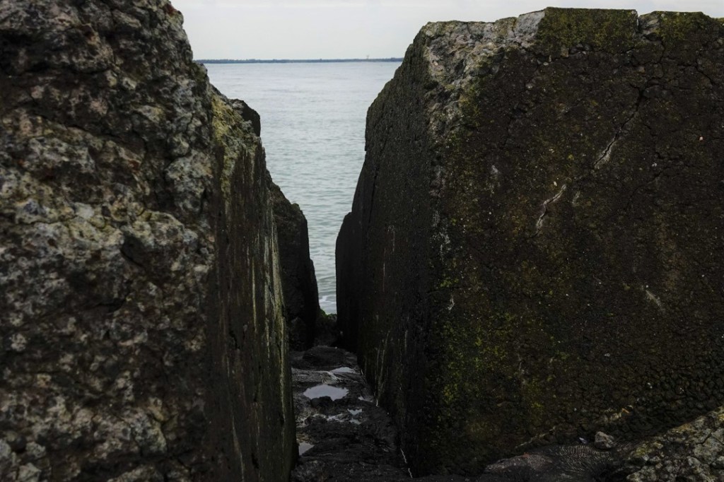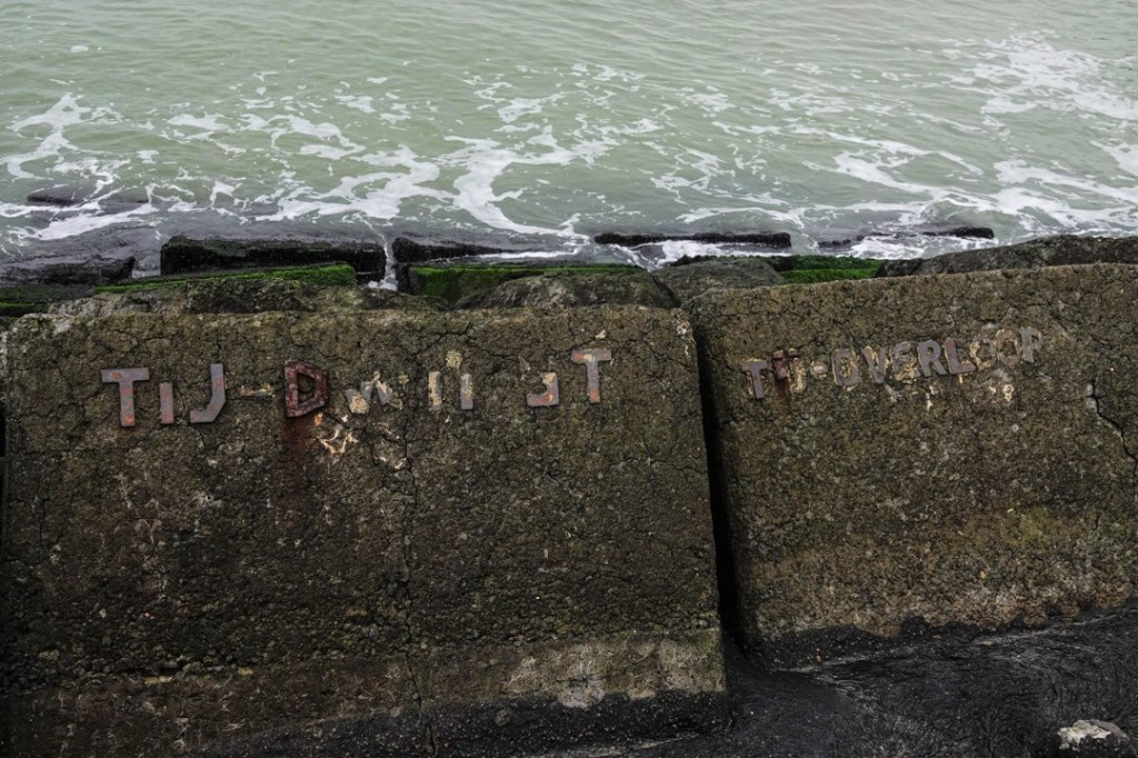 Op de grote steenblokken waar de pier van gemaakt is, zag ik opeens woorden staan. Het was een hele rij en ze gingen allemaal over het tij. Een kunstwerk dus, helaas erg in verval.