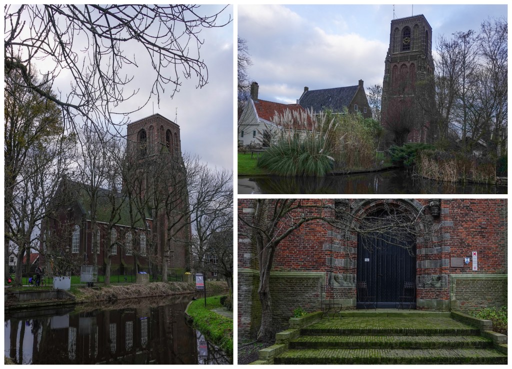 Onze route ging rond de toren. Deze is echt indrukwekkend breed. Het is dan ook de basis voor een hoge spitse toren. Die waren ze tenminste van plan om te bouwen, maar de ondergrond, die hier veelal uit veengrond bestaat zou niet bestand zijn tegen zo’n gewicht, dus is mijn gestopt op een zeker punt. Nu zijn we gehecht aan de stompe toren. Hij dient regelmatig als uitkijktoren. Op het platte dak schijn je prachtige vergezichten over de omgeving te hebben. Ik moet toch die klim maar eens gaan wagen, als de toren weer open is.