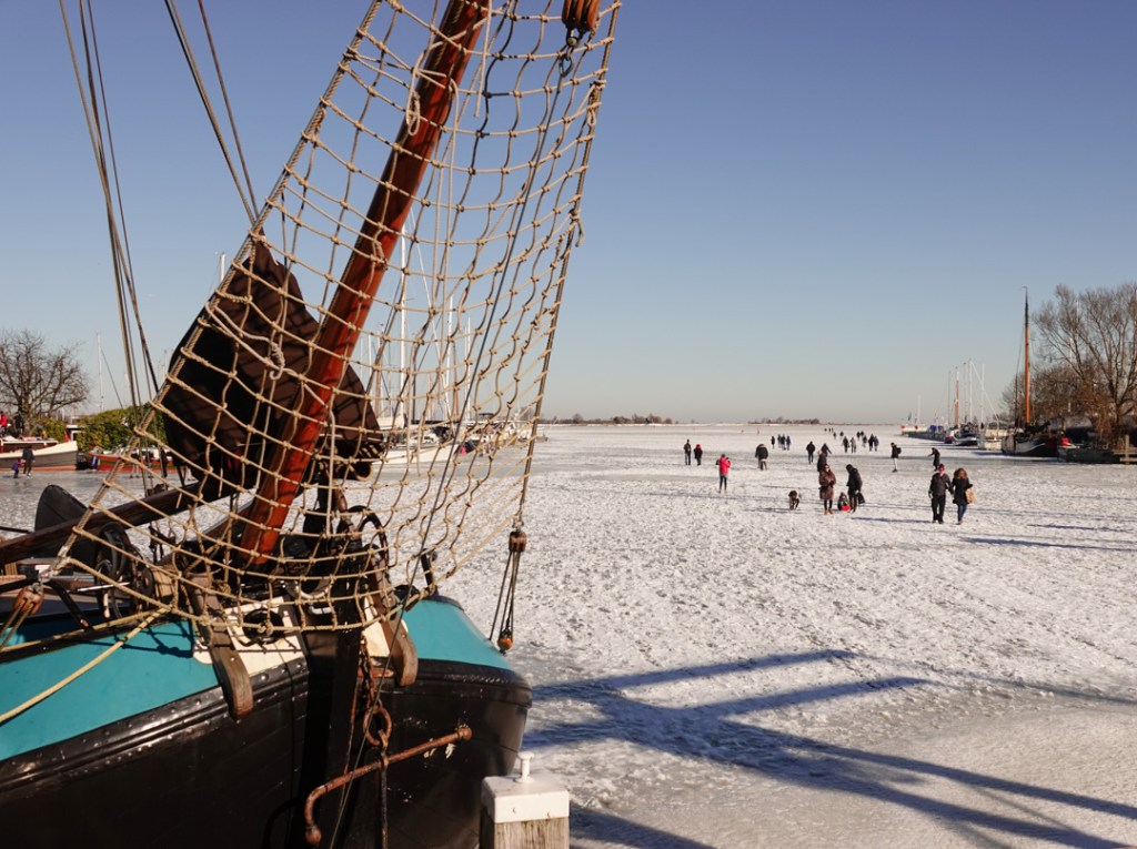 De hele Gouwzee is dichtgevroren, dus is het voormalige eiland Marken over het ijs bereikbaar. Het is nogal een hobbelige ondergrond, waarop het moeilijk lopen of schaatsen is, maar je ziet toch wel mensen die kant opgaan.