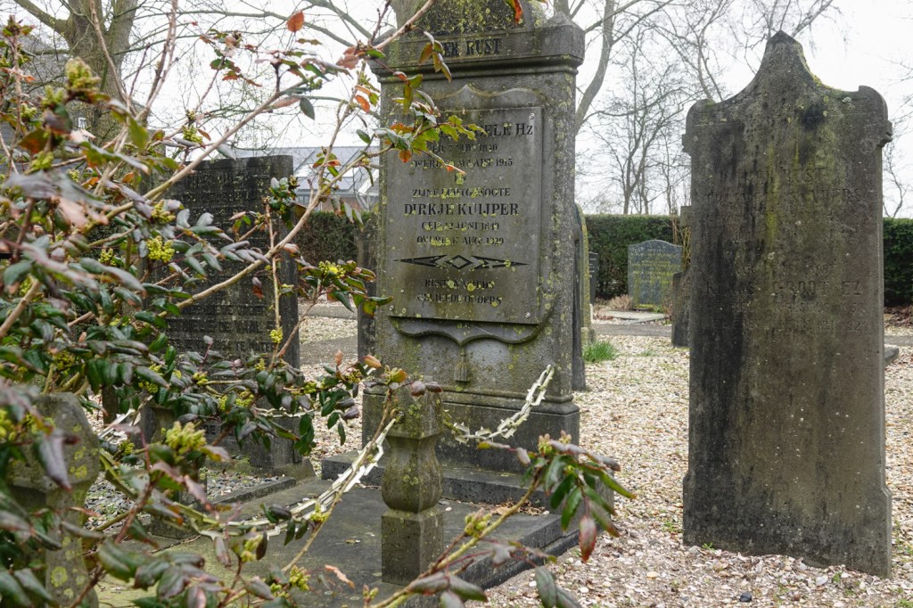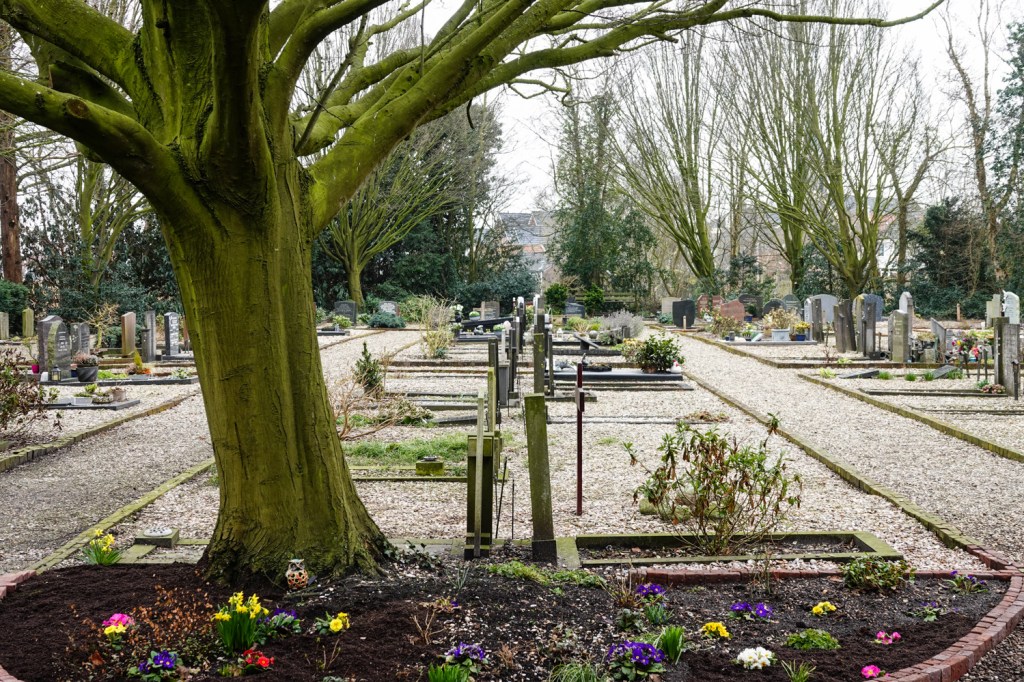 In ons eigen dorp hebben we twee kerkhoven, één voor de katholieken en de algemene begraafplaats. De katholieke plek, aan de rand van het dorp, vind ik eigenlijk kaal, open en sfeerloos. Daar heb ik toevallig geen foto’s van. Na het bezoek aan het Watergangse kerkhof wilde ik toch ook eens kijken op onze algemene begraafplaats. Dat is vlak bij het park, naast de kerk en is omringd door bomen en struiken. Dat geeft het aan deze plek iets intiems. Je voelt je er alleen, weg van de wereld. Omringd door de wind en vogelgeluiden. Dat heeft een kerkhof nodig. Een fijne plek om te zijn.