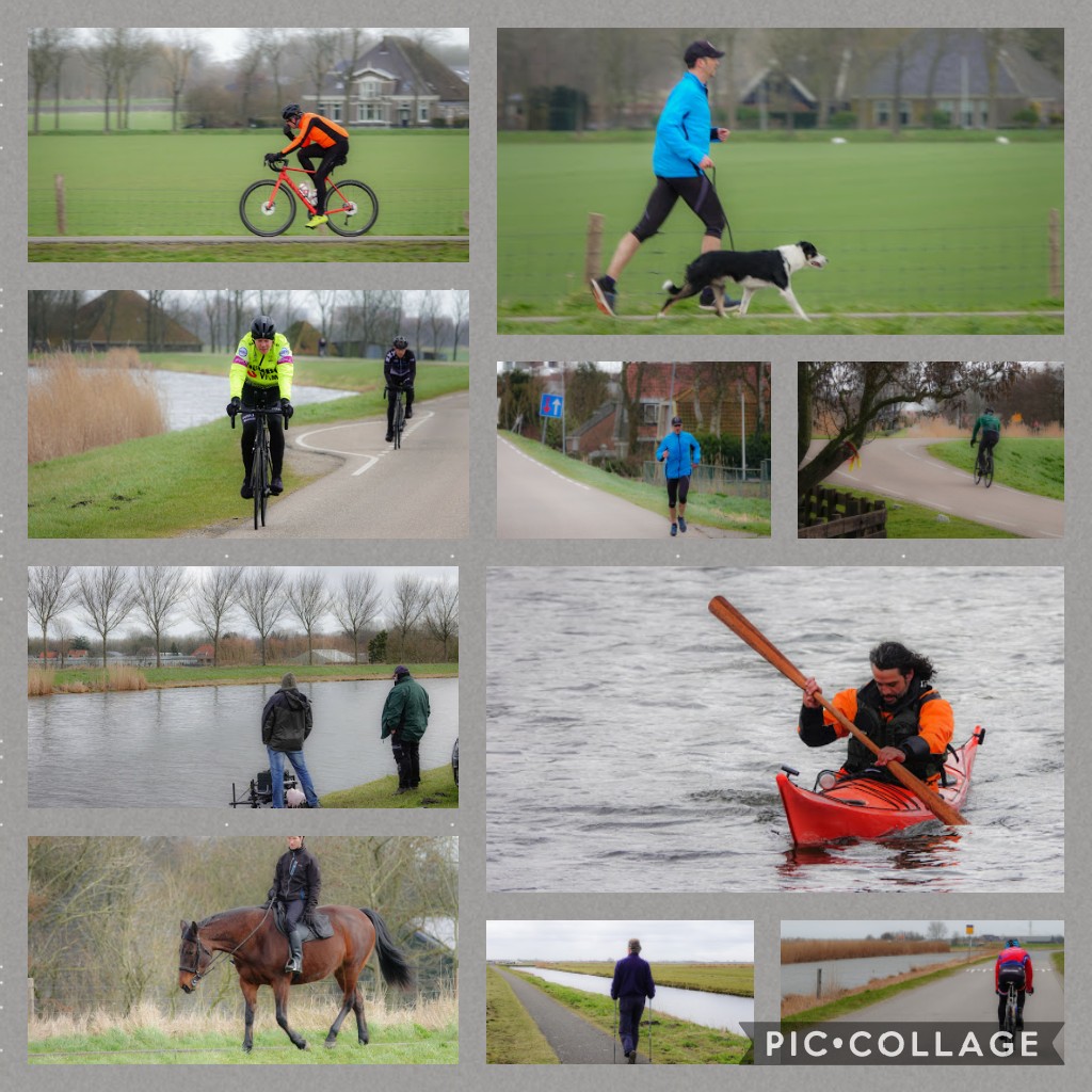 Maar opeens realiseerde ik me, dat ik nog een foto-opdracht had te vervullen en daar was hier alle gelegenheid voor. Het onderwerp was sport of sportief. Hoe later het werd op de ochtend, hoe drukker op de weg. Daardoor werd het gewoon prijsschieten. Ik keek nog op van de variatie aan sportieve uitingen die ik uiteindelijk bij elkaar verzameld had. Ik heb ze in collage gezet. Nu moet ik kiezen, wat ik inlever voor de opdracht. Ik heb zowaar keuzestress terwijl ik deze opdracht moeilijk invulbaar vond, vanwege het stopleggen van alle sporten in corona-tijd. Zo zie je maar weer.