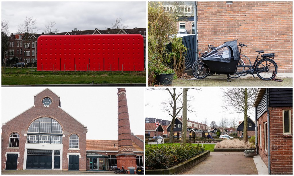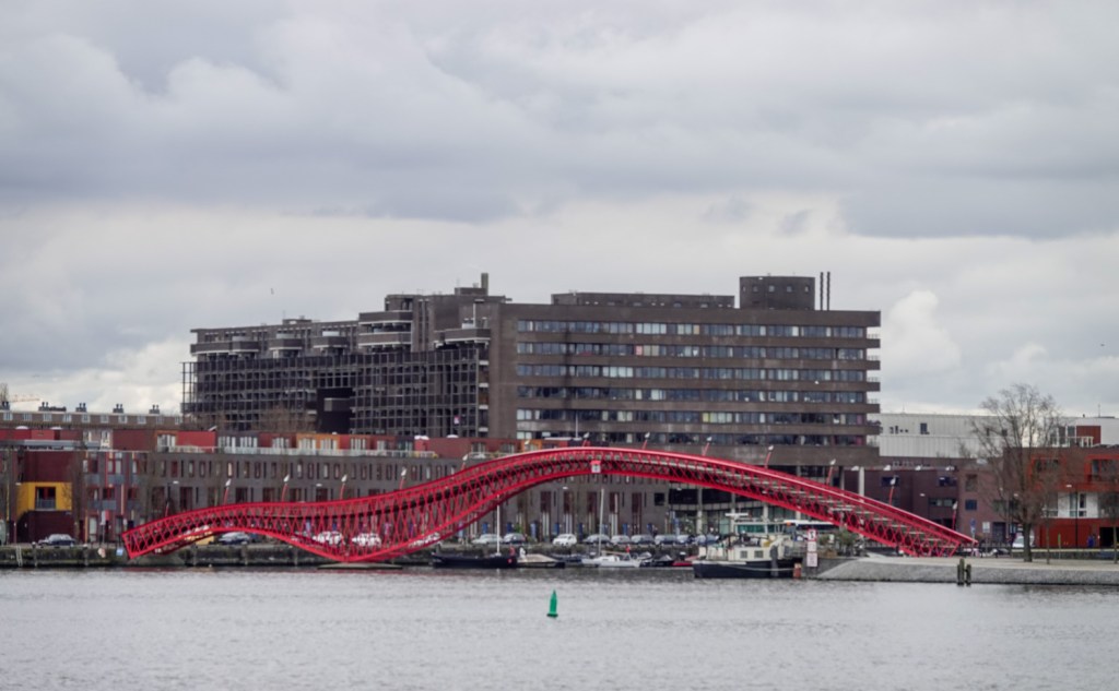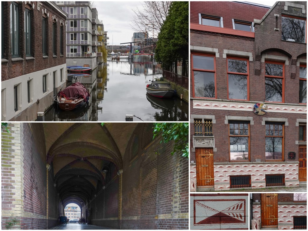 Bij het oranje gebouw, bekend als Wilhelminadok, waar ooit een boot tegenaan gevaren is, gingen we de wijk meer in.