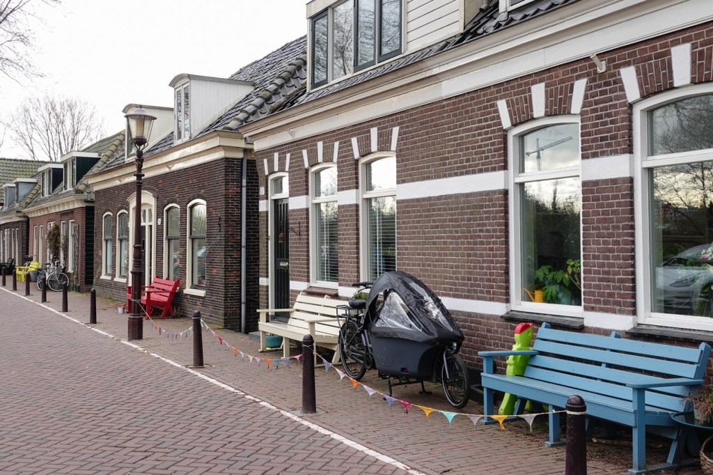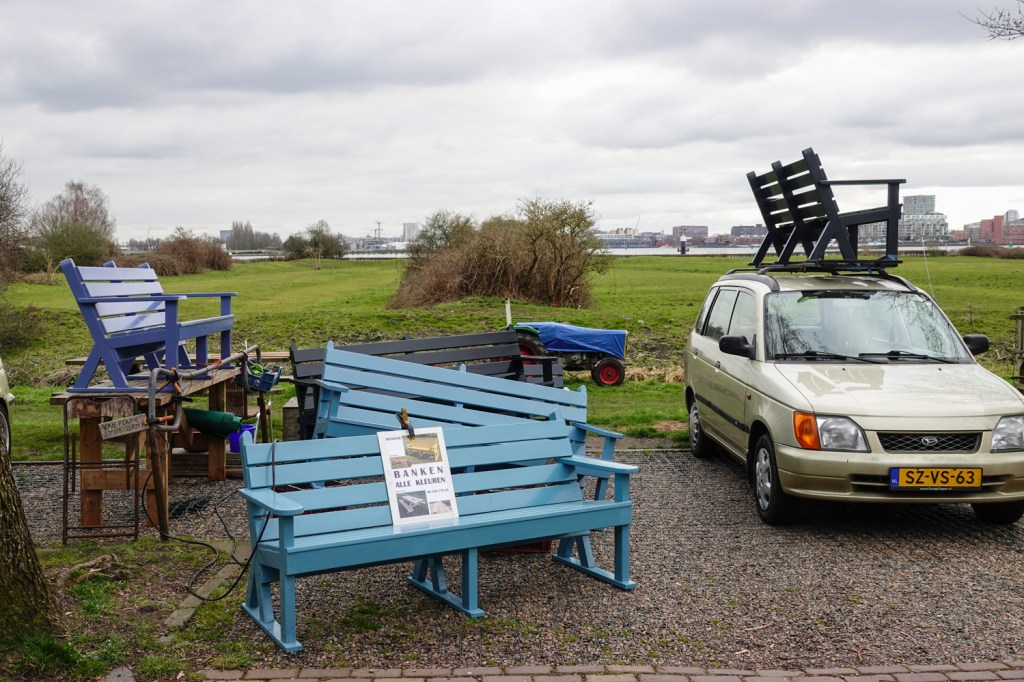 Na de Nieuwendammerdijk loop je door over de Schellingwouderdijk. Overal vielen ons de gezellige banken al op in allerlei fleurige kleuren.
