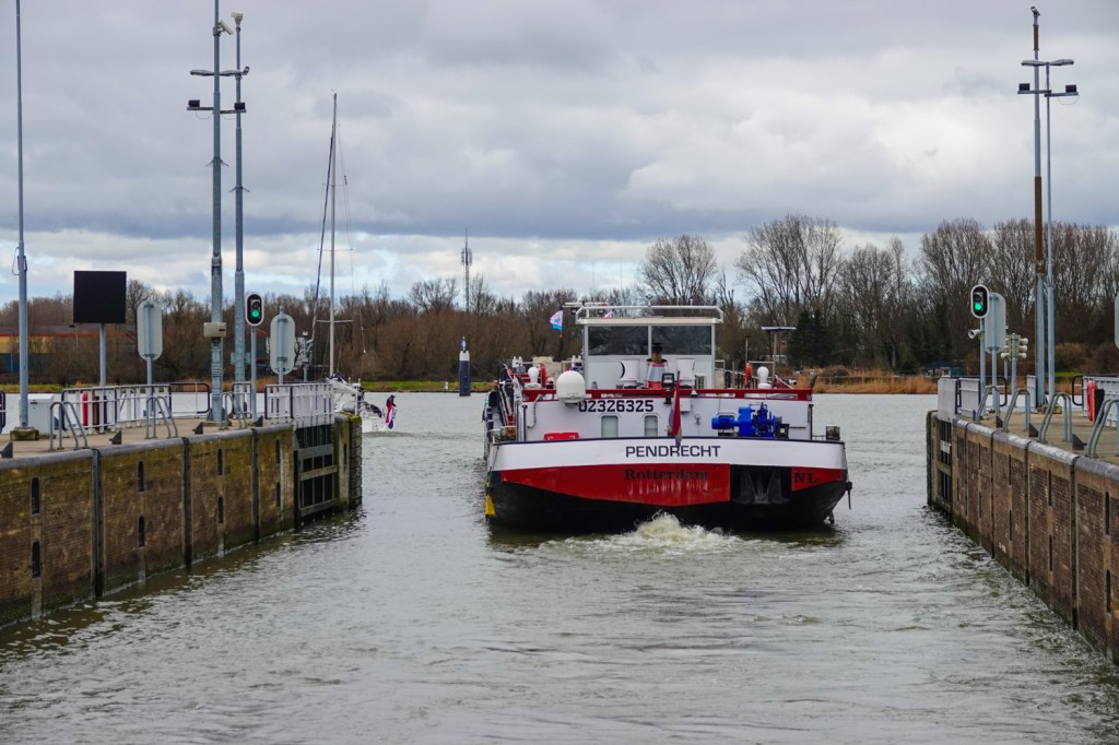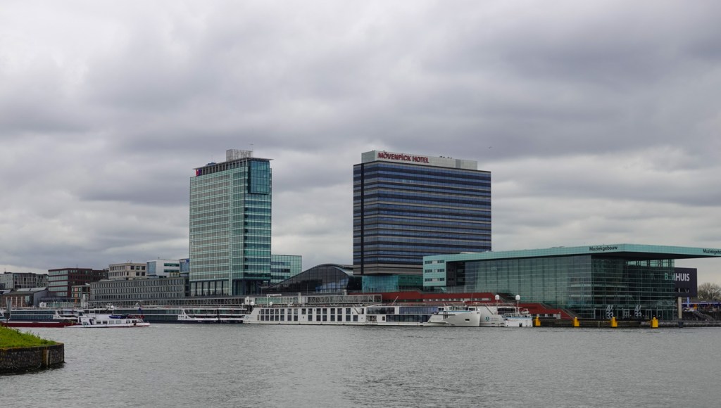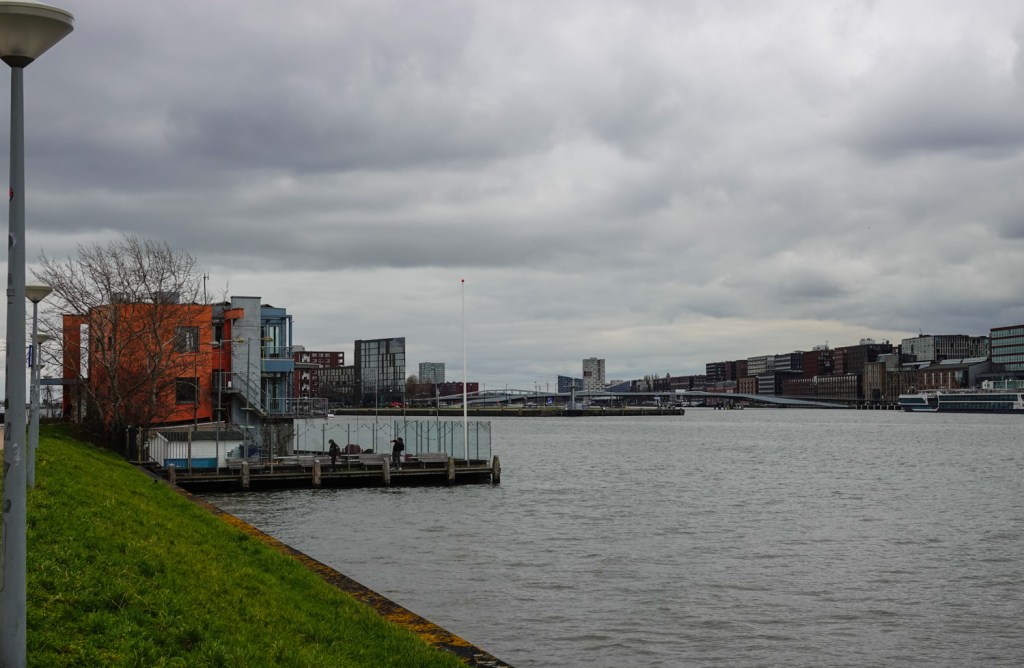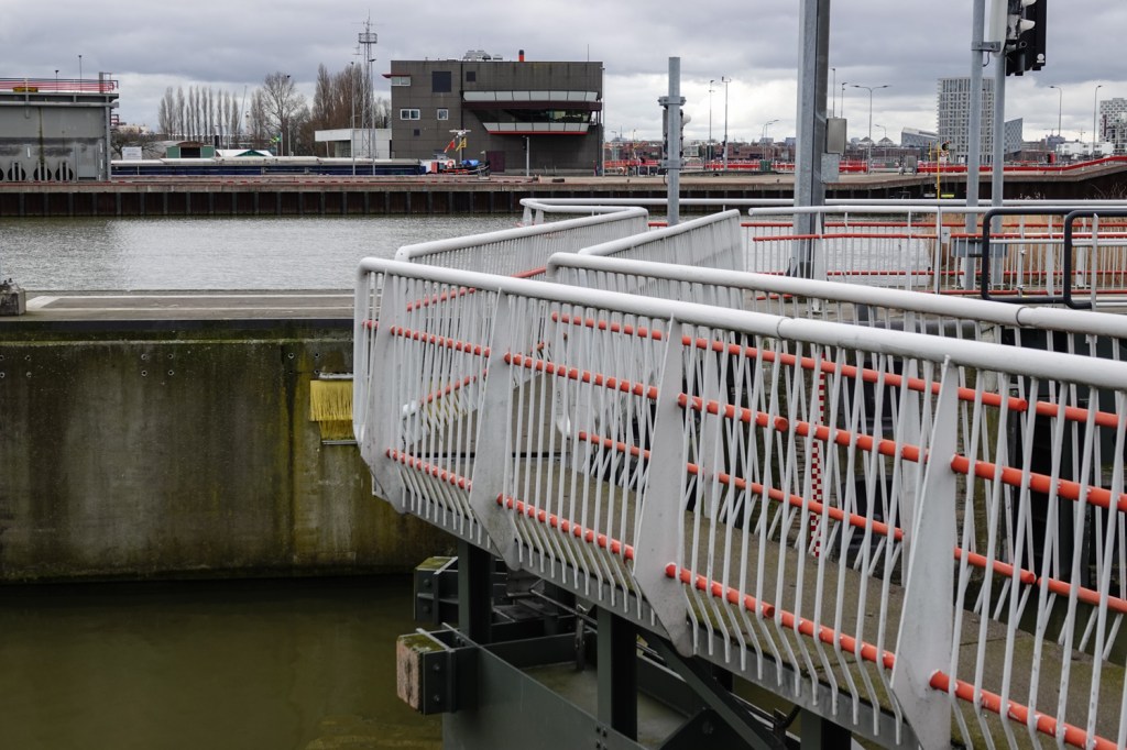 Het was geen fotogeniek weer. Daarom dachten wij dat een stadse omgeving met dit weertype misschien beter geschikt is om te gaan wandelen en wat rond te kijken. En die stad werd Amsterdam. Als startpunt namen we, net als toen, de Schellingwouderdijk in Noord. Van daaruit steek je door via de Oranjesluizen. Dit keer was het wachten geblazen, want er passeerden juist een paar grote schepen. Maar die bedrijvigheid is leuk om van zo dichtbij te bekijken.