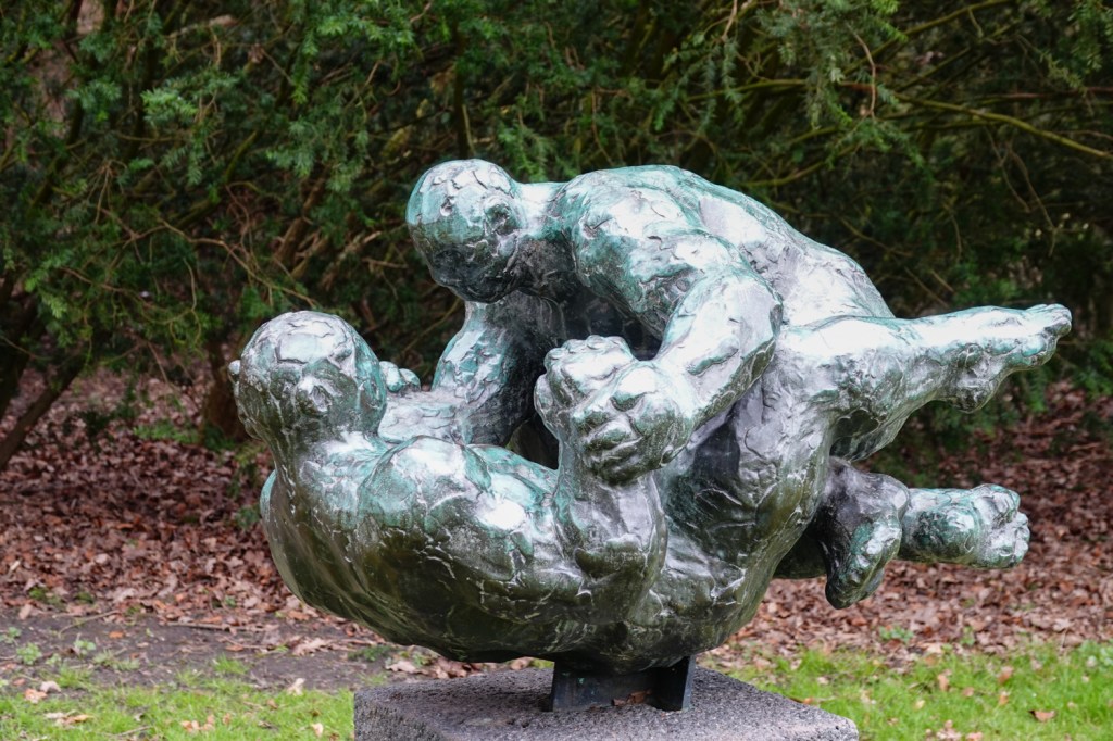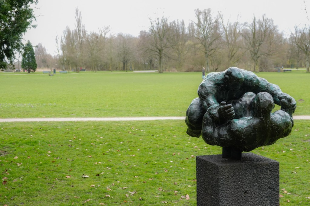 dus moesten we de Schellingwouderbrug over om daar te komen. Na de wijk Zeeburg namen we een route door het Flevopark. Daar sierde het beeld de Worstelaars van Hans IJdo uit 1960 een grasperk.