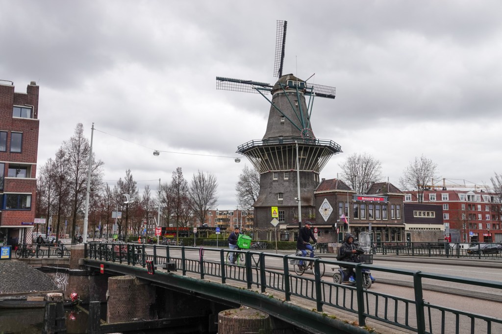 De molen de Gooyer met een bekend biercafé ernaast, blijft ook apart zo in de stadse omgeving.