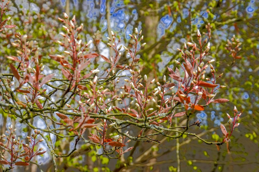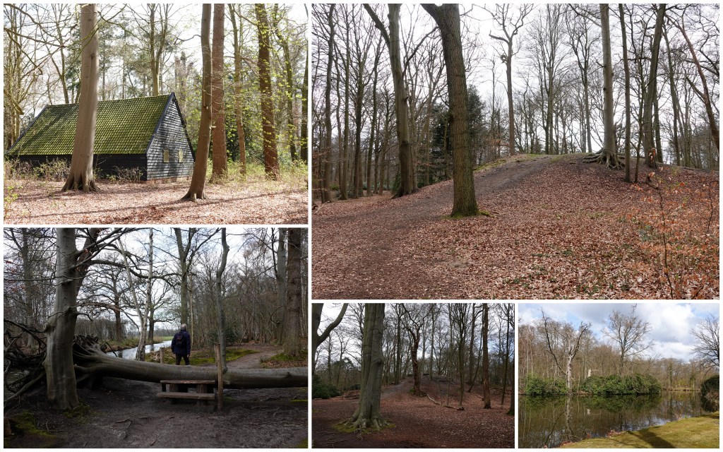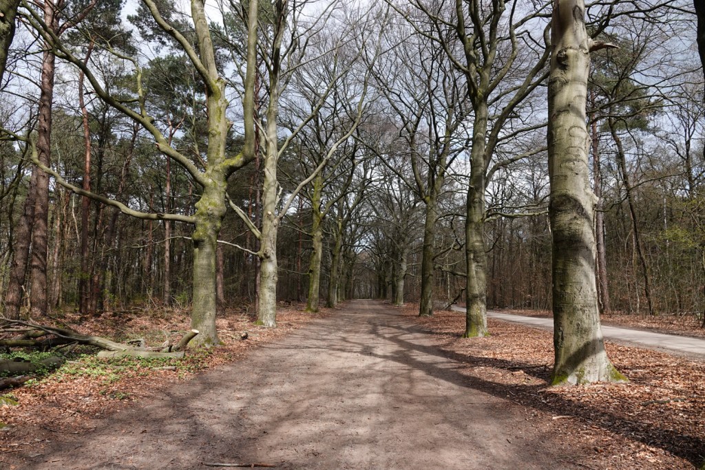 Die bomen staan weliswaar nog zo goed als in wintertooi, dus waren we benieuwid, of dit wel de geschikte tijd van het jaar was voor deze route. Het was heel wat beschutter lopen door bosrijk gebied, dan door ons open Waterland. En het was nog best koud, dus konden we die luwte best waarderen.