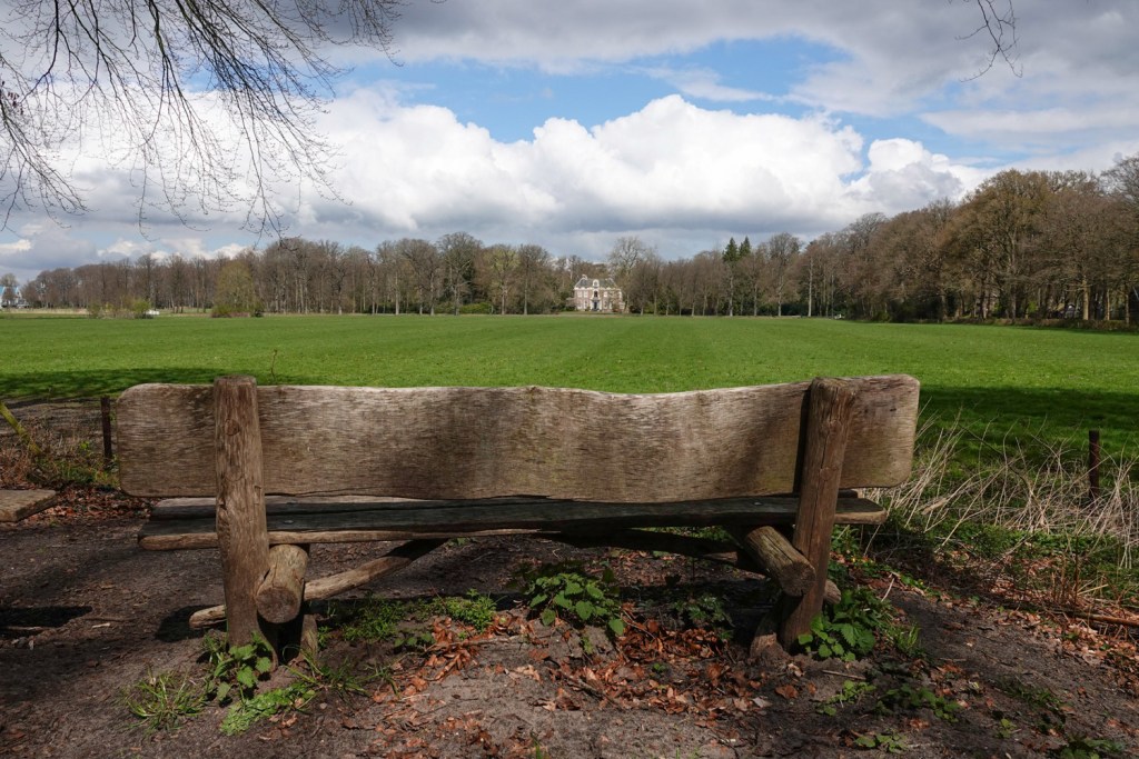 Het was sympathiek, dat zelfs een rustbank in de route was opgenomen. Wij verorberden ons lunchpakket dus met uitzicht op landhuis Hilverbeek.