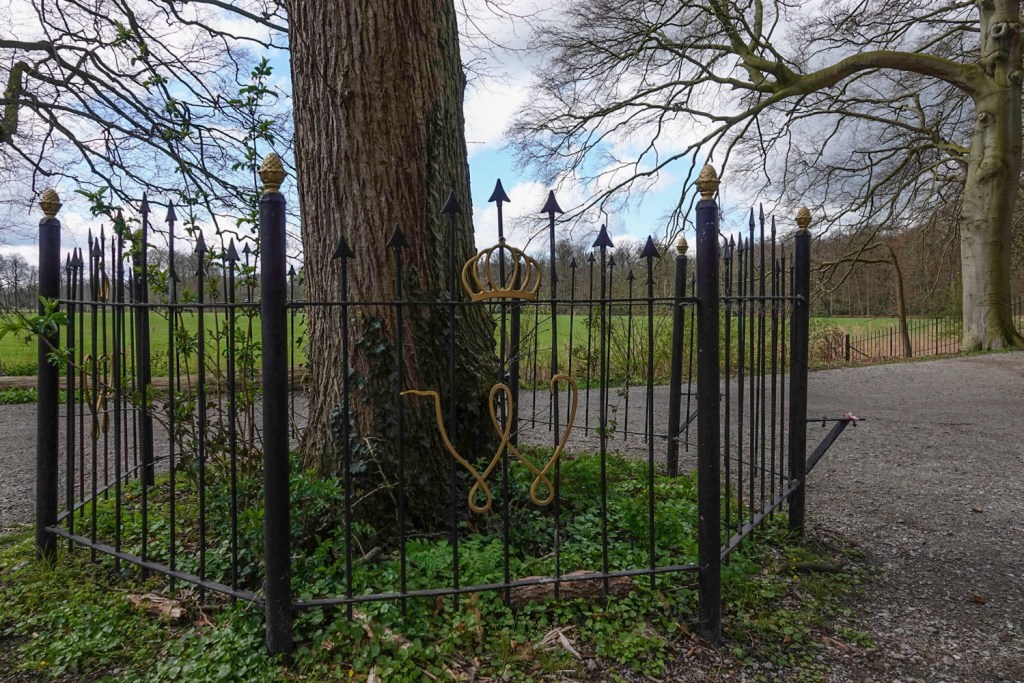 We wandelden richting ’s Graveland zoals de app, samengesteld door boswachter Johan van Galen Last, voorstelde. De eerste boom, die aandacht verdiende was de Wilhelminaboom, een Hollandse linde gepland in 1898 in het jaar dat Wilhelmina als koningin werd ingehuldigd. Bij deze boom had ik even alleen maar aandacht voor het hek.