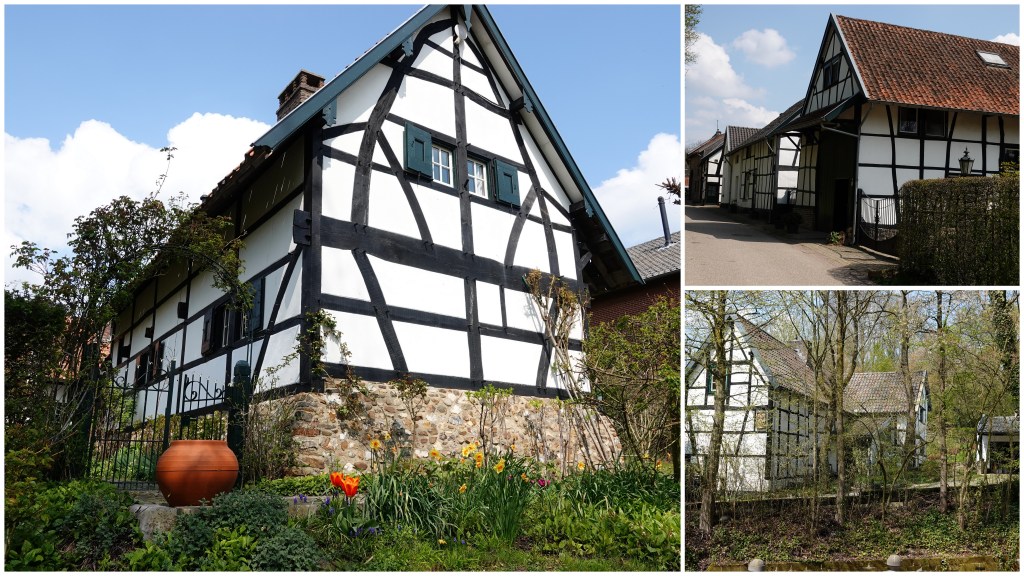 We bewonderden de stereotiepe vakwerkwoningen. Oorspronkelijk ontstond deze bouwstijl, omdat deze huizen in een paar dagen afgebroken en ergens anders weer opgebouwd konden worden. Zo hadden pachters een sterkere onderhandelingspositie om tot nieuwe pachtvoorwaarden te komen. Dragende balken werden genummerd om die reden. De vakken deed men stevige gevlochten wilgentakken, die weer opgevuld werden met stro en leem en vervolgens witgekalkt. (bron: app van Natuurmonumenten)