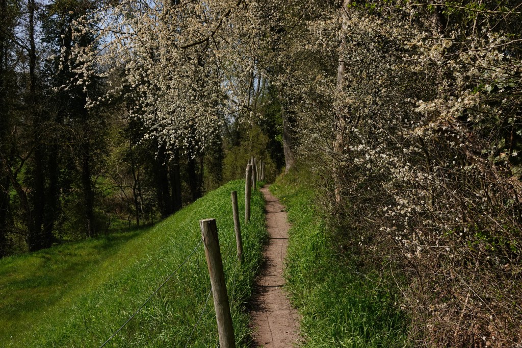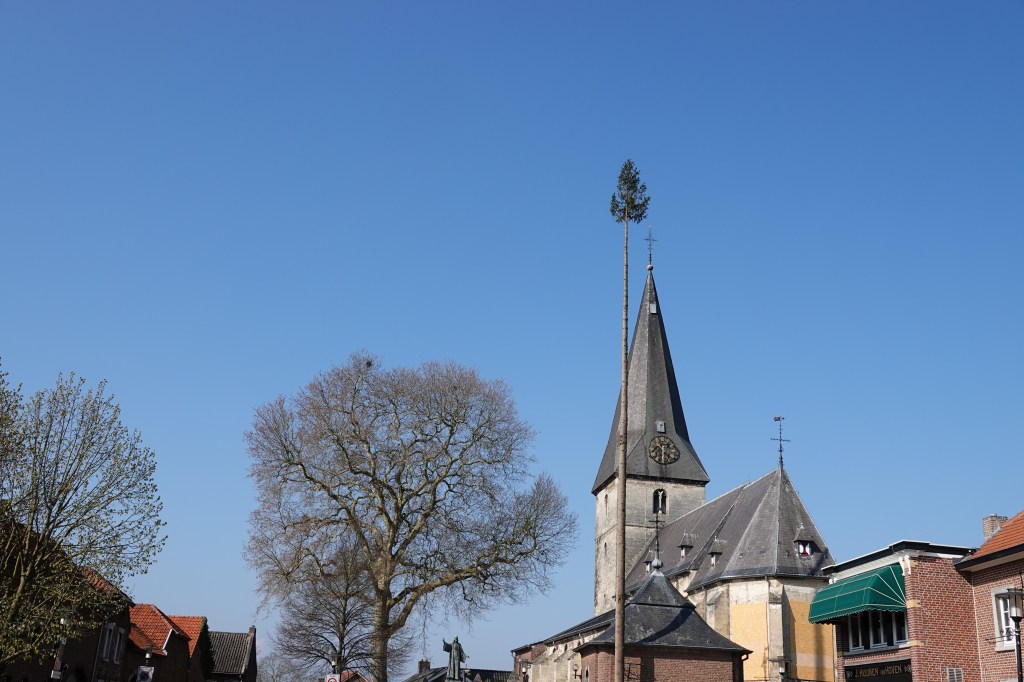De laatste dag van onze korte vakantie in het zuiden van het land begint zonovergoten. Dat belooft weer een mooie wandeldag te worden. We doen dit keer een rondwandeling, weer met de app van natuurmonumenten. De route brengt ons naar prachtige plekken en wijst ons op bijzonderheden in de natuur. Onze startplek is vandaag bij de kerk van Noorbeek. Het is de Brigidakerk en de kale den ernaast is de zogenoemde mei-den, die ieder jaar door de ongetrouwde mannen van Noorbeek (de jonkheid) gekapt, vervoerd en opgericht wordt en dat al 380 jaar! In 1634 is hier namelijk een belofte aan de heilige Brigida gedaan toen er pest heerste onder het vee. Dit gebruik is sinds 2015 opgenomen in de nationale inventaris Immaterieel Erfgoed van de Unesco.