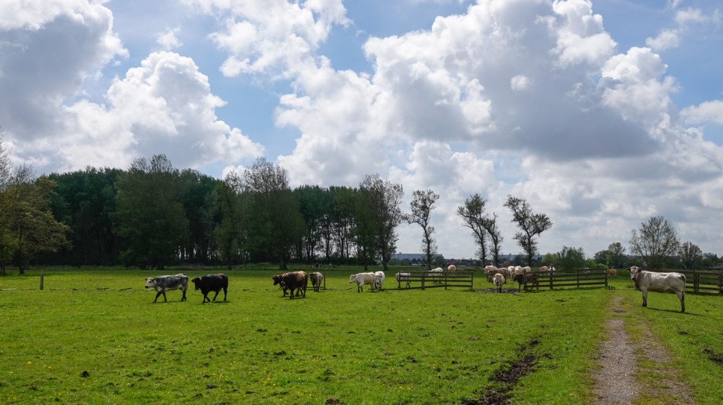 De kudde runderen verkaste naar de wei, waar wij net aan kwamen lopen. De dieren bekijken je eens en lopen dan rustig door naar hun nieuwe grazige weide.