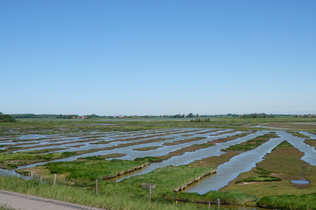 Verderop zagen we de typische inlaag en karrenvelden van natuurgebied Rengerskerke. Vroeger werd de grond hier grotendeels afgegraven om de dijken te verhogen. Ook werden op sommige plekken reservedijken aangelegd. Op die manier ontstond een inlaag. Daarin zijn de sporen nog te zien van de karren die de grond afvoeren naar de dijk, de z.g.n karrensporen. Tegenwoordig zijn dit belangrijke gebieden voor vogels, die er hun voedsel vinden en het als rustgebied kiezen.