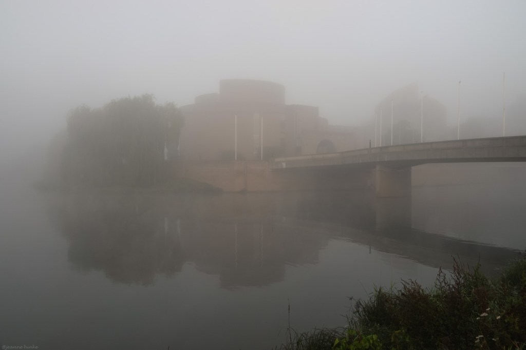 Om een beetje in de sfeer te komen reden we met Raymond van het Groenewoud galmend door de auto naar het zuiden. Op de eerste ochtend van ons lange weekend was er mist, dus ik toog meteen naar de Maas. Van het gouvernementsgebouw waren alleen nog maar de contouren te zien.