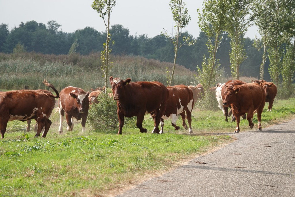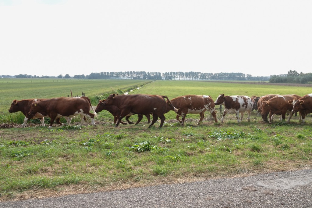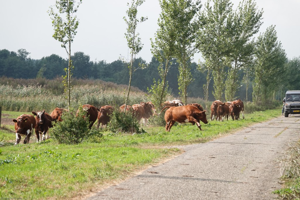 Ik geniet telkens weer, vooral tijdens onze wandelingen, van alle koeien die ik zie, dat moge duidelijk zijn. Laatst wisten ze een voor ons lange saaie weg tot een spannende onderneming te maken. Heel in de verte zagen we al koeien op de weg. Aangezien het er niet breed was met aan één kant een boerensloot, denk je meteen, hoe zal dat gaan.