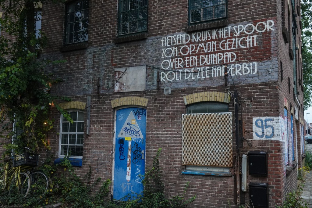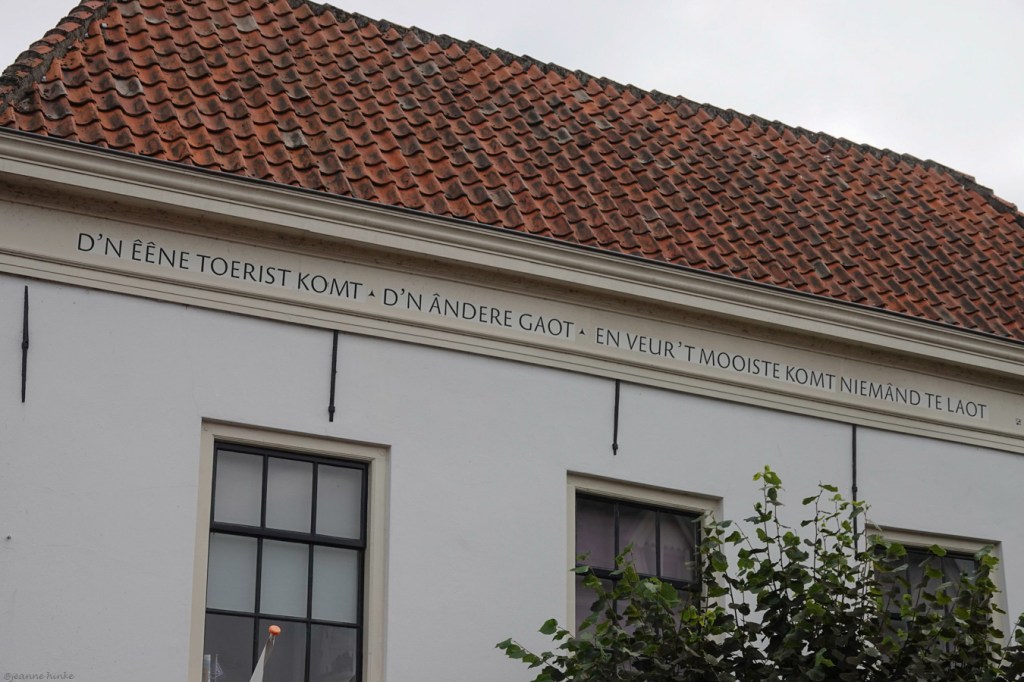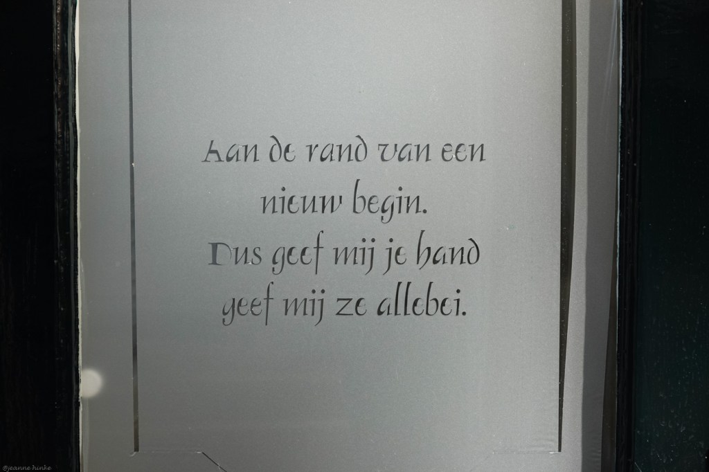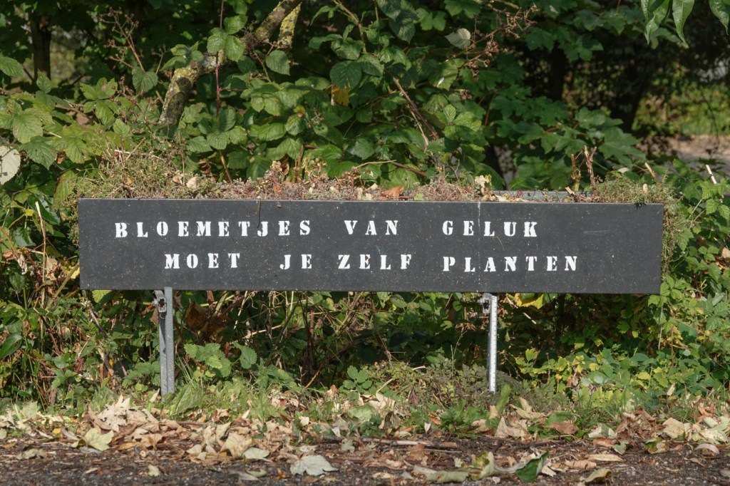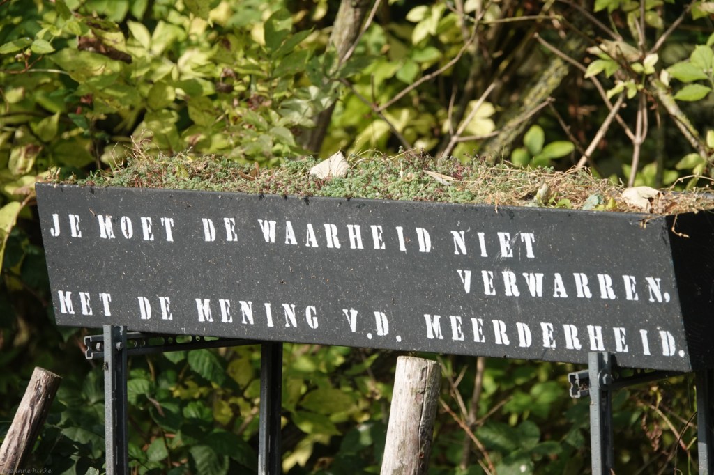 Je staat ervan te kijken, hoeveel tekst er in het straatbeeld verwerkt is. Met straat bedoel ik ook kleine achteraf-weggetjes. Daar is het zo mogelijk nog verrassender om met teksten geconfronteerd te worden. Ergens in de Betuwe zag ik een hele serie borden zomaar langs de kant van de weg, met daarop waarheden als een koe, of juist niet?