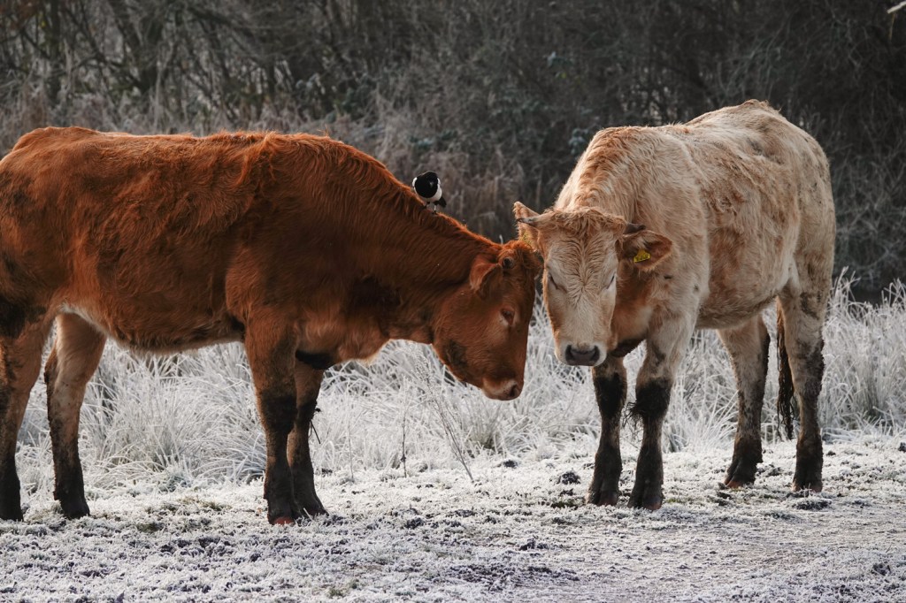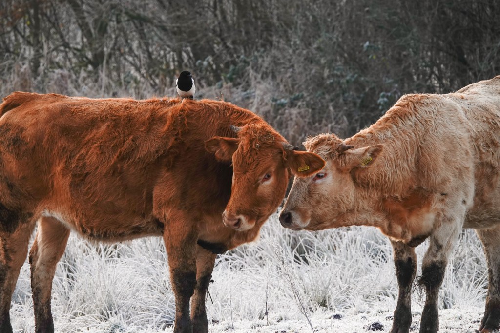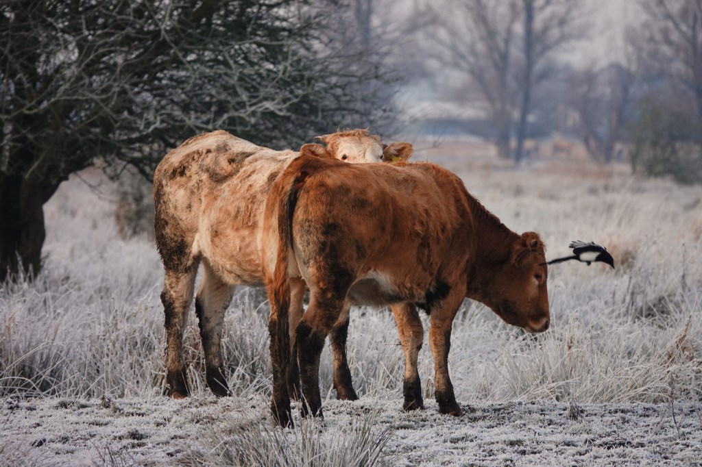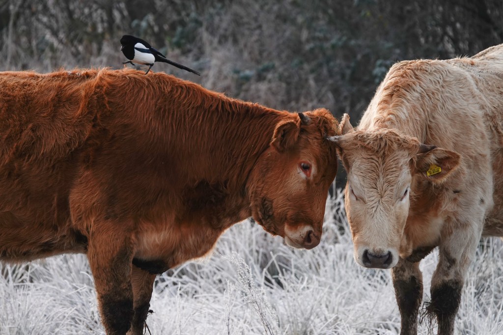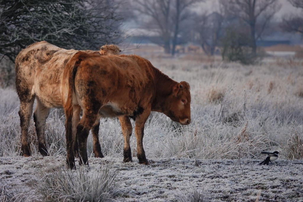Tijdens deze winterse wandeling was ik getuige van het spel van de ekster met de runderen, die eigenlijk alleen maar oog hadden voor elkaar.