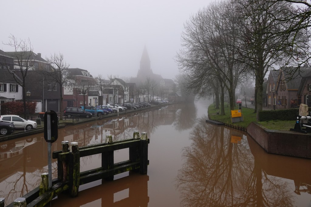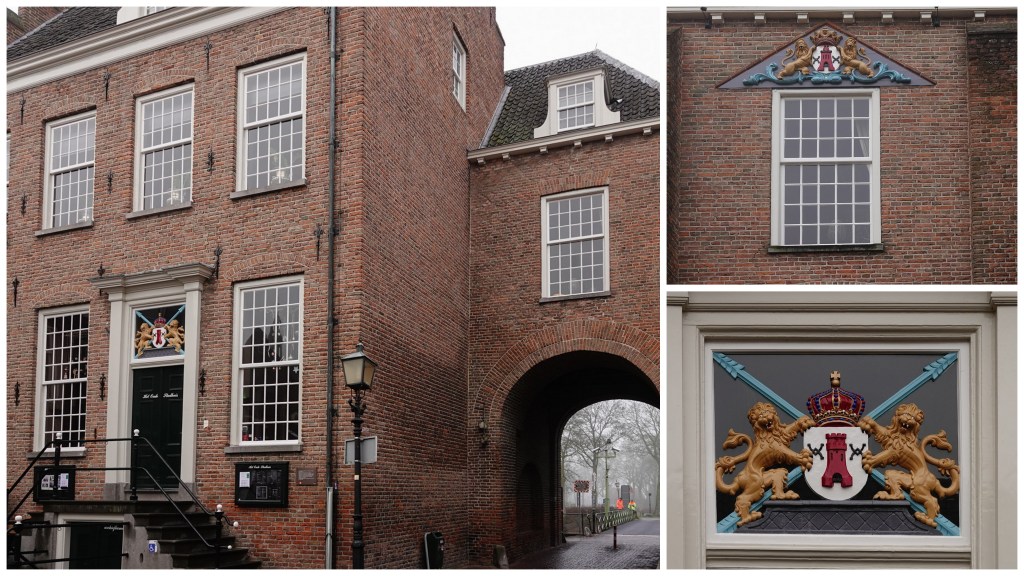 Op een T-splitsing buiten het dorp pakten we wonder boven wonder de pijltjes weer op. Door de mist, die slechts even leek op te trekken, konden we ons niet oriënteren op bijvoorbeeld kerktorens of bebouwing in de omgeving. Uiteindelijk kwamen we uit bij Montfoort. We konden er buiten op een bankje even een koffie to go opdrinken. We bewonderden even de enige toegangspoort, die er nog over is van de oorspronkelijke drie in dit oude vestingstadje.