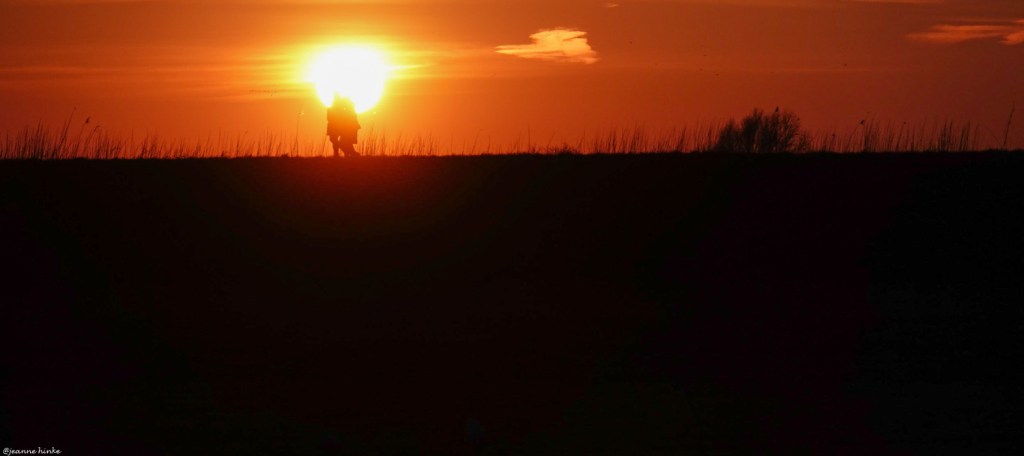 Na een tip, dat het rond zonsondergang zou gebeuren, ging ik net vóór het bewuste tijdstip naar de rietlanden, want ik wilde het met eigen ogen zien.  Het was windstil geworden, dus een heerlijke avond. Dat vonden deze mensen, die nog een stukje over de dijk wandelden, ook.