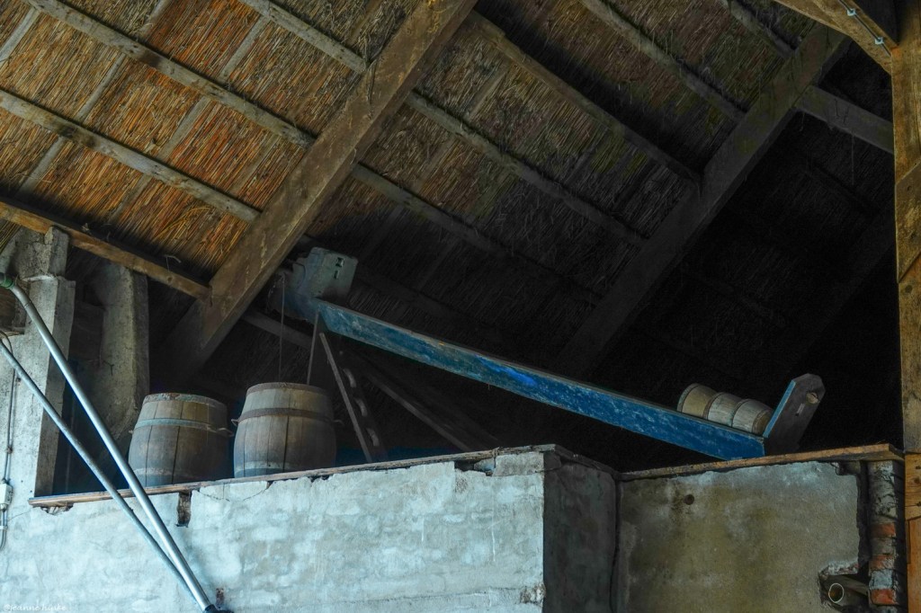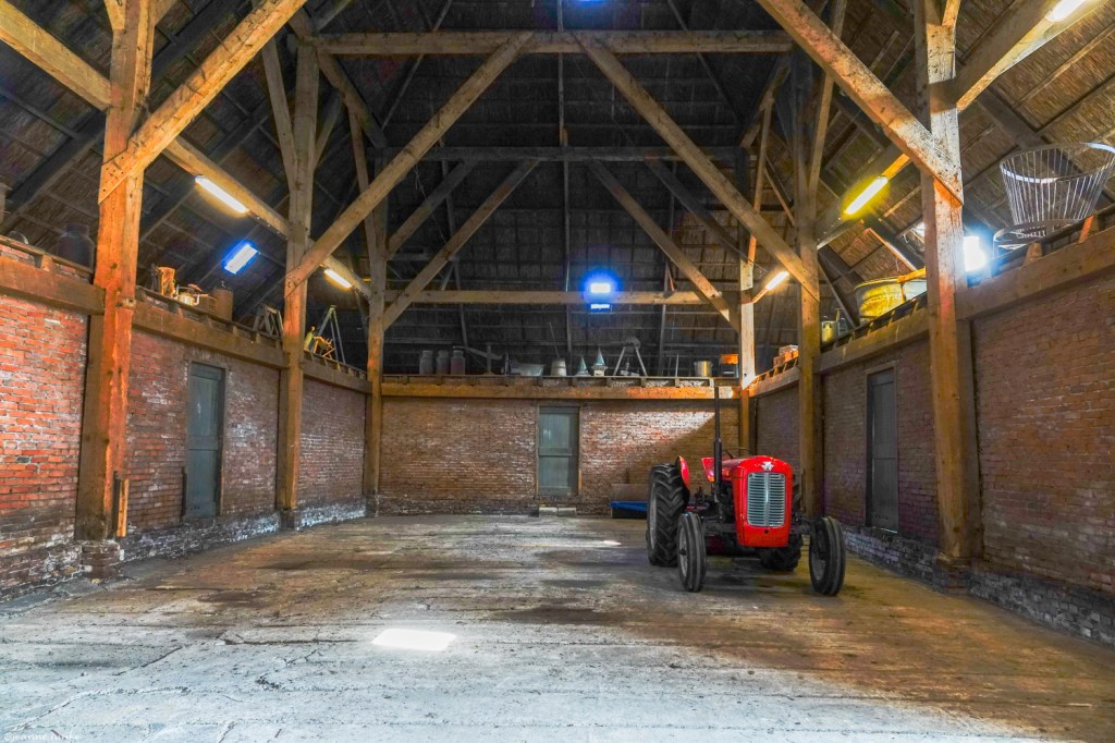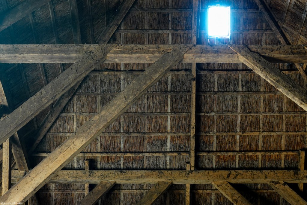 Hier een overzicht van de oude spanten van het gigantische dak van de schuur, die nu nog één moderniteit herbergt.