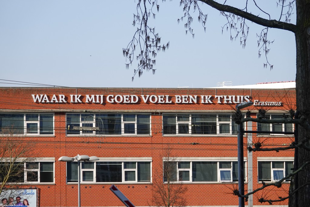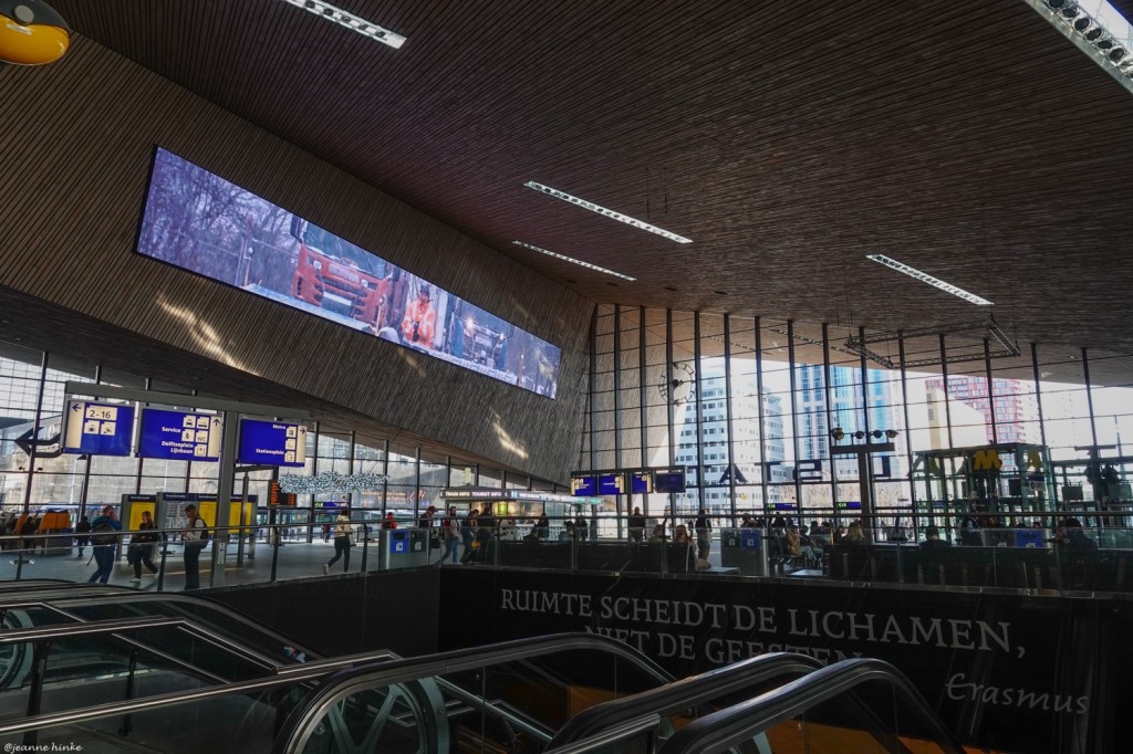 Het zal waarschijnlijk in elke stad zo zijn, maar in Rotterdam viel het me op, dat er overal zoveel tekst te lezen was. Bij aankomst op het Centraal station werden we al verwelkomd met een spreuk van Erasmus. Ik begrijp wel, dat men trots is op deze stadsgenoot.